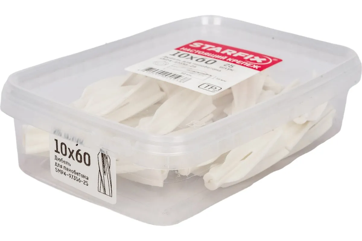 Дюбель для пенобетона STARFIX 10x60 мм 25 шт. SMP4-97356-25 предназначен для пенобетона (пористого бетона), имеет высокие внешние ребра, что помогает расширить площадь соединения с материалом. Дюбель распирается шурупом. Изготовлен из нейлона, что позволяет использовать крепеж в широком диапазоне температур.