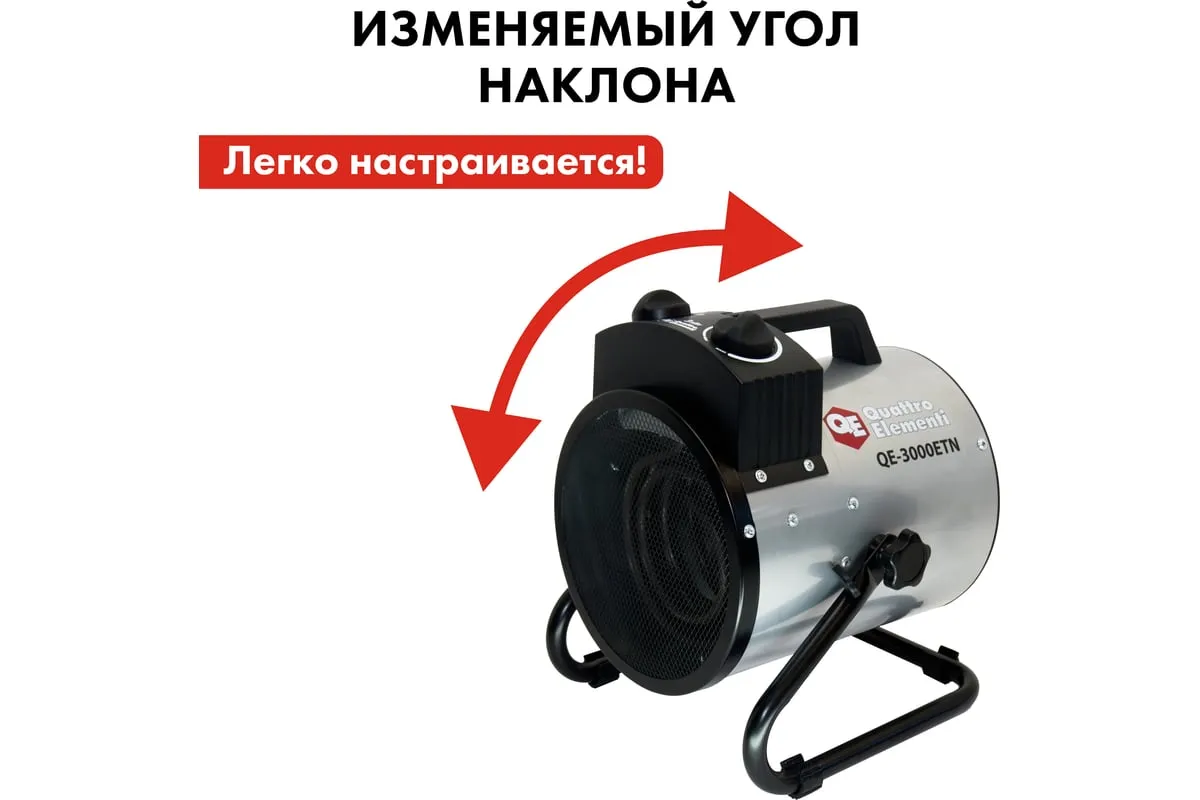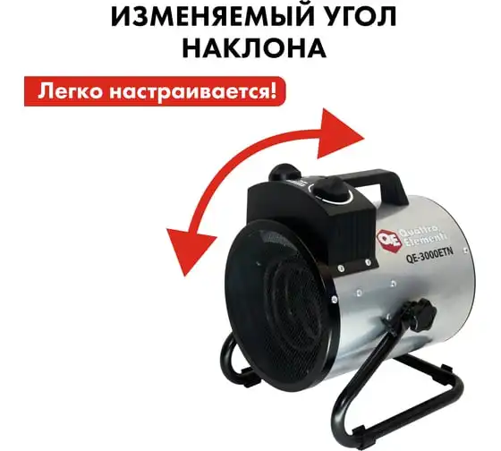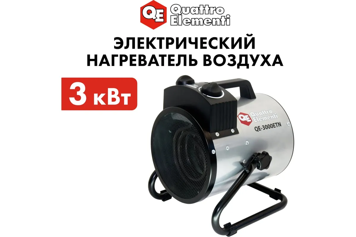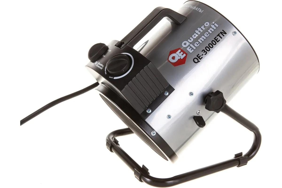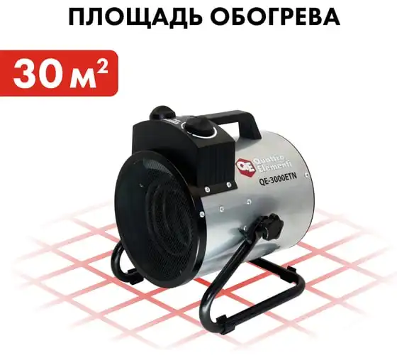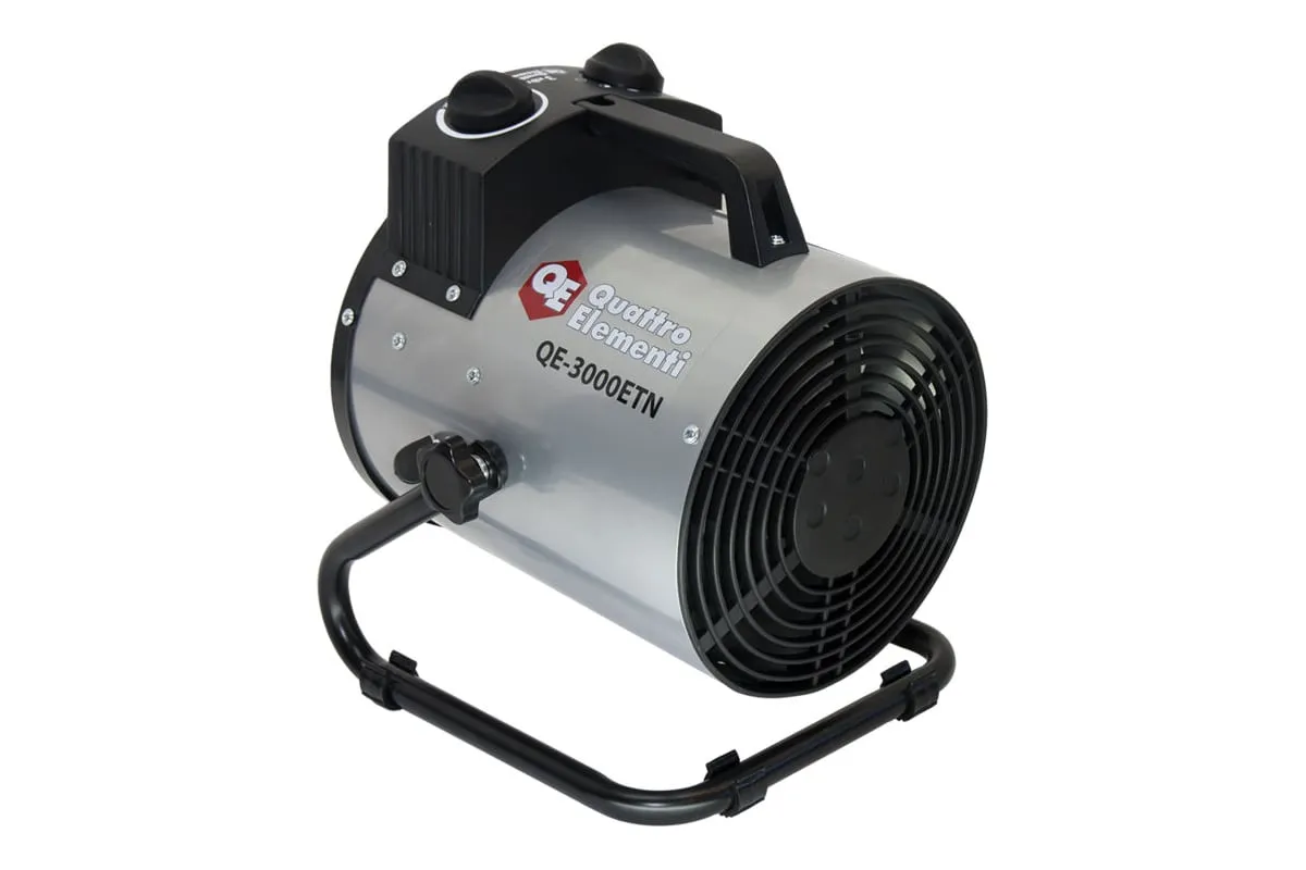 Электрическая тепловая пушка QUATTRO ELEMENTI QE-3000 ETN 649-257 работает от сети 220 В. Данная модель оснащена трубчатым нагревательным элементом, выполненным из нержавеющей стали. Корпус пушки изготовлен из листовой стали. Для удобной переноски предусмотрена ручка. Для регулировки направления воздушного потока по вертикали за счет изменения положения корпуса предусмотрен специальный вентиль.