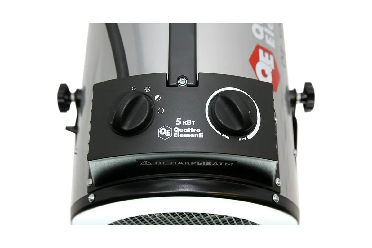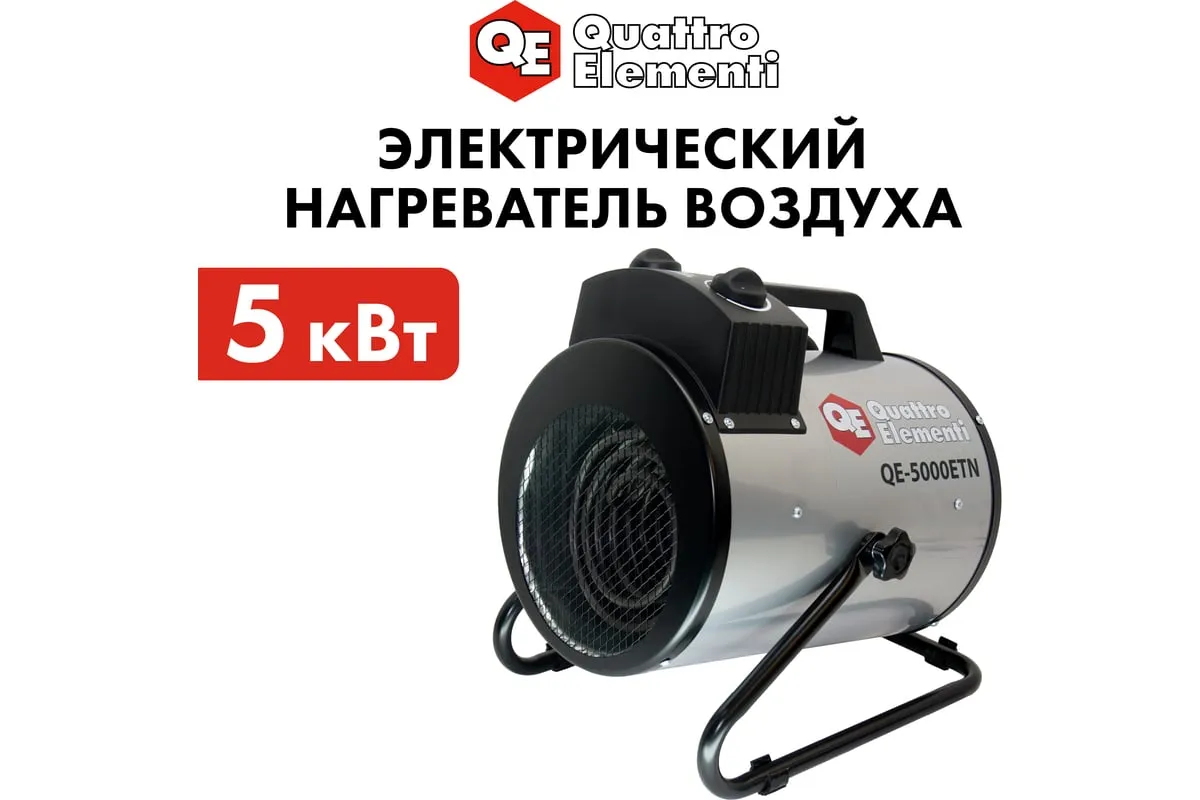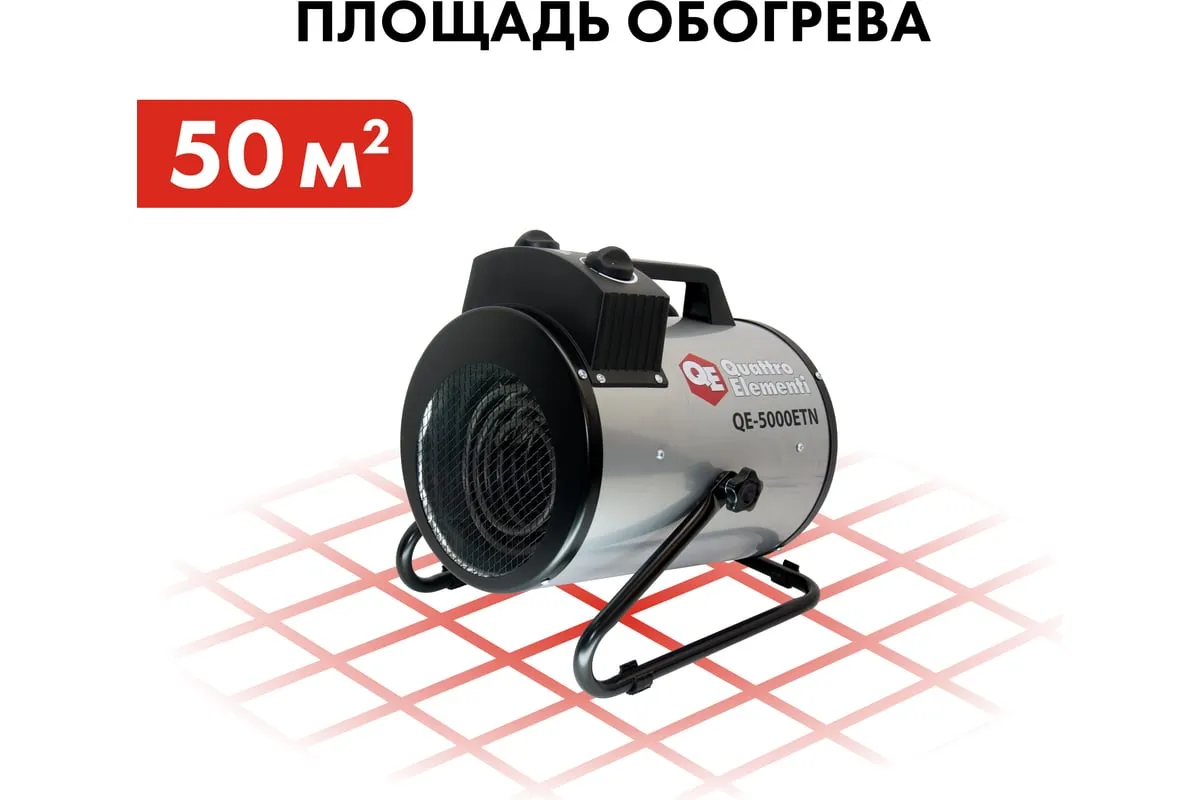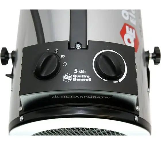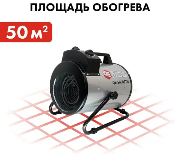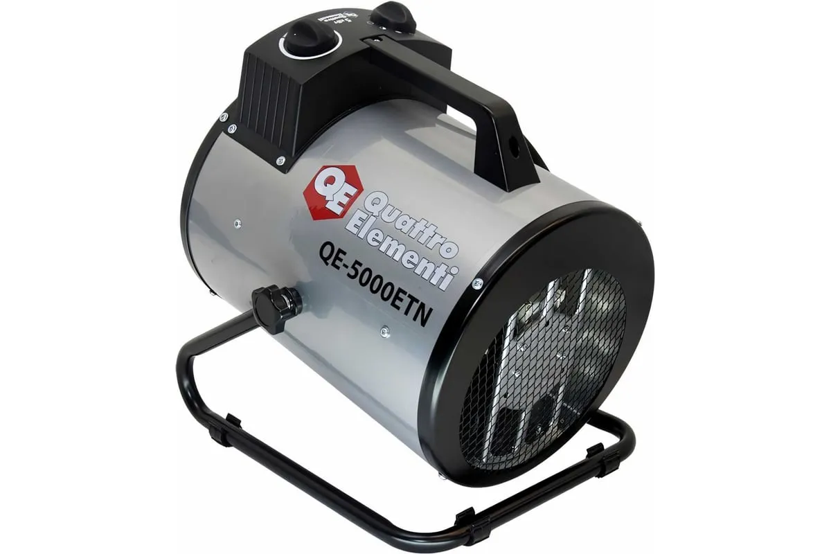 Электрическая тепловая пушка QUATTRO ELEMENTI QE-5000 ETN 649-264 работает от сети напряжением 220В. Данная модель имеет трубчатый нагревательный элемент из нержавеющей стали. Пушка устанавливается на пол на опорные ножки. Для удобства транспортировки предусмотрен ручка. Тепловая пушка имеет две ступени мощности обогрева 3300/5000 Вт и режим вентиляции без нагрева.