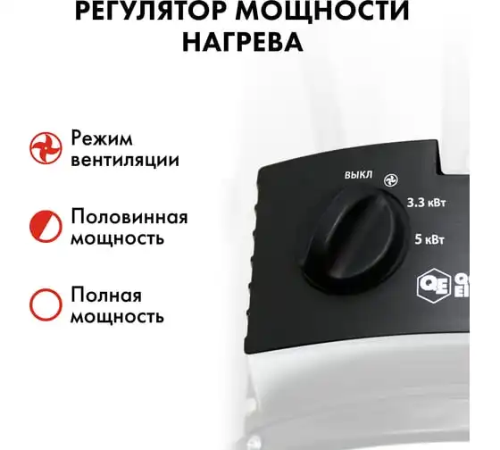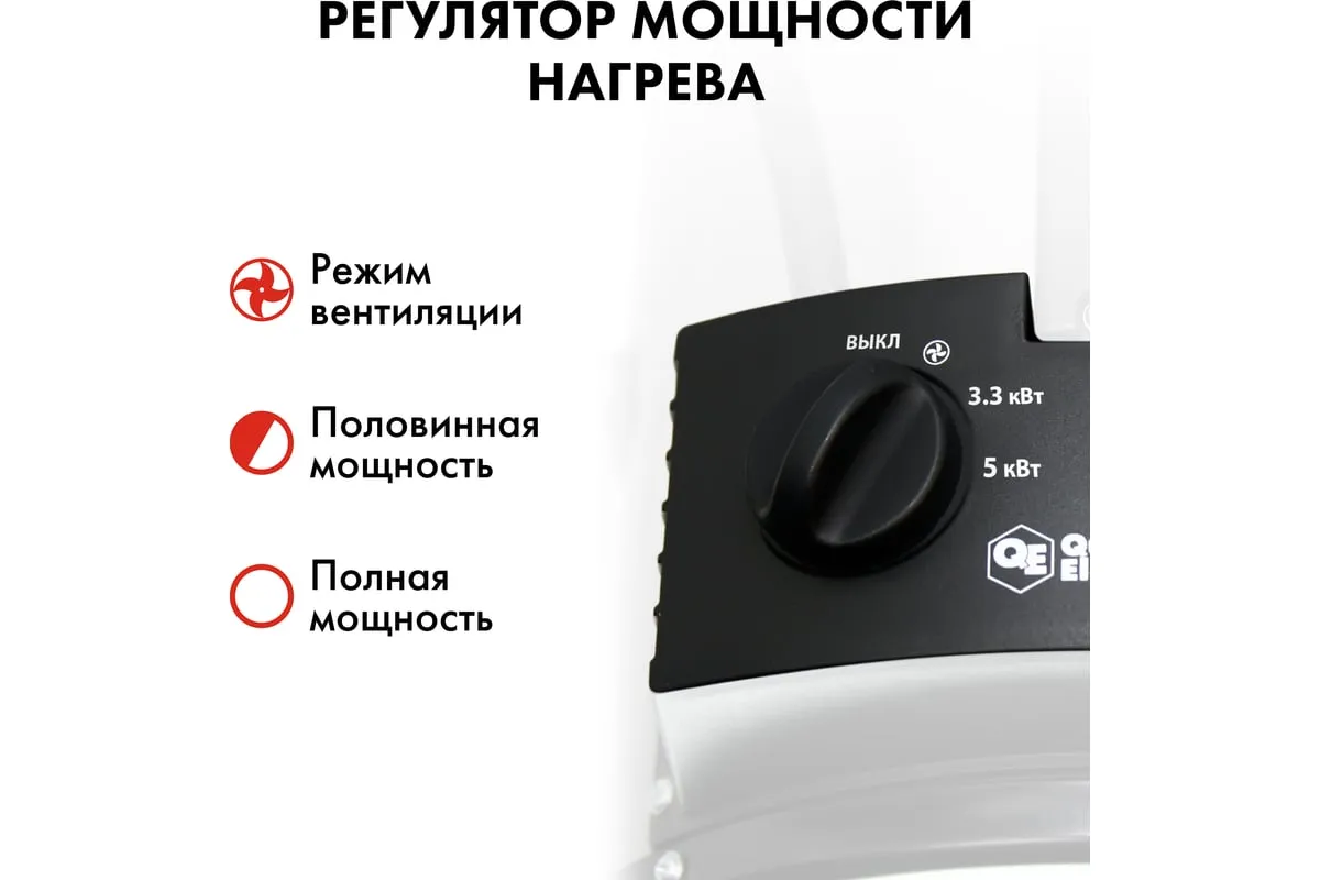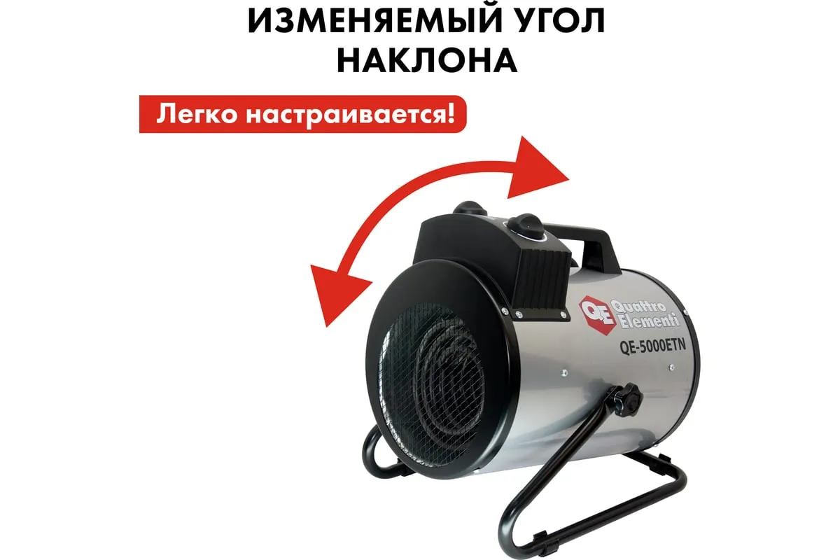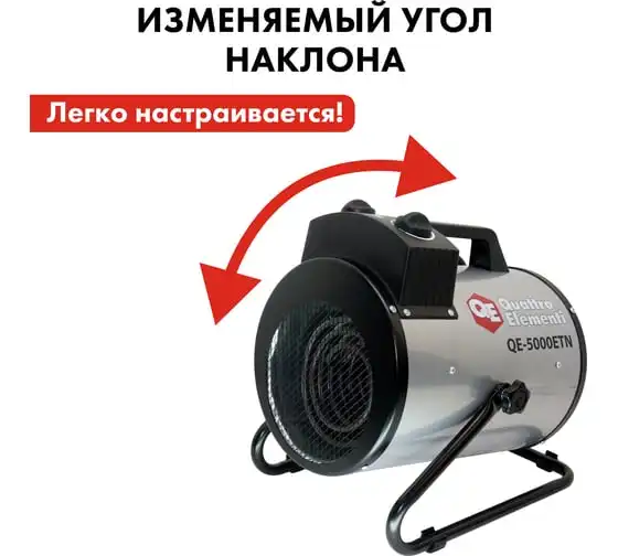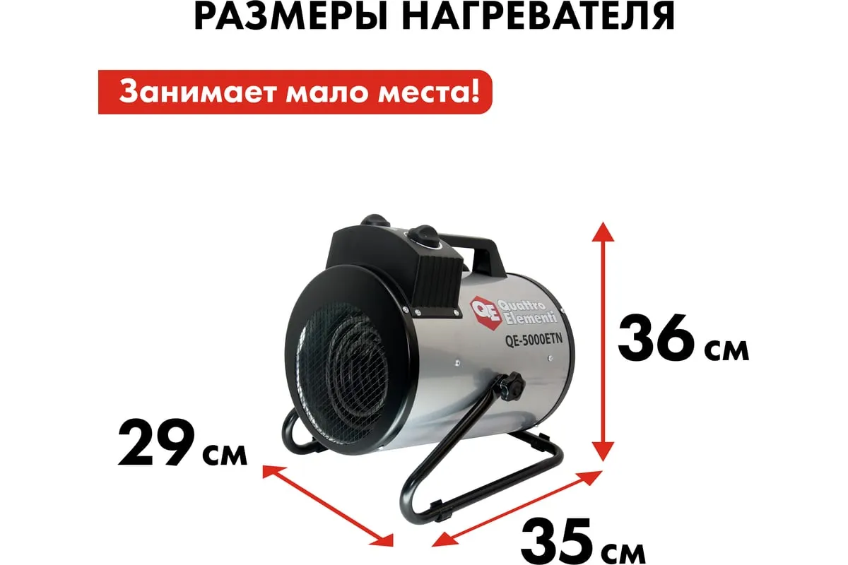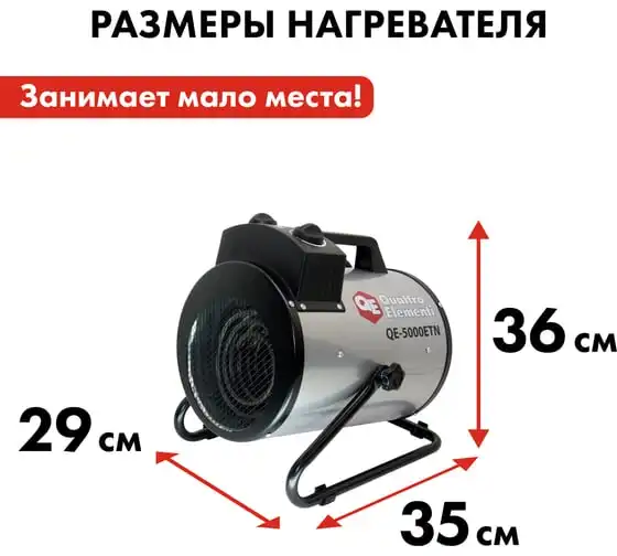 Электрическая тепловая пушка QUATTRO ELEMENTI QE-5000 ETN 649-264 работает от сети напряжением 220В. Данная модель имеет трубчатый нагревательный элемент из нержавеющей стали. Пушка устанавливается на пол на опорные ножки. Для удобства транспортировки предусмотрен ручка. Тепловая пушка имеет две ступени мощности обогрева 3300/5000 Вт и режим вентиляции без нагрева.