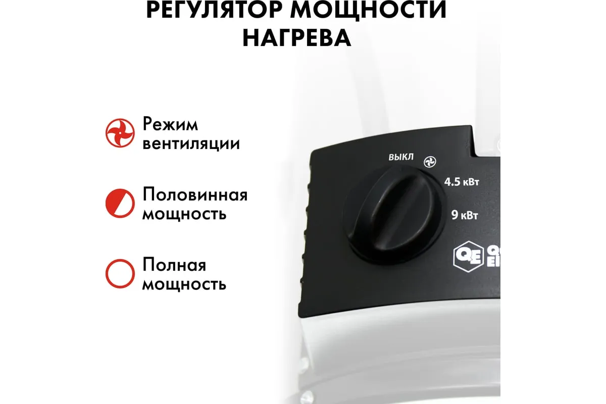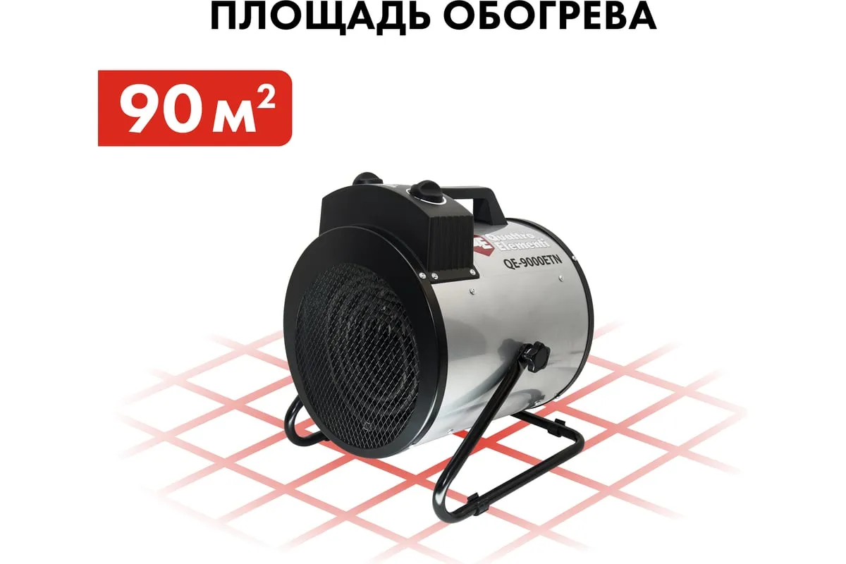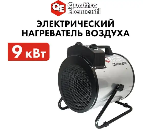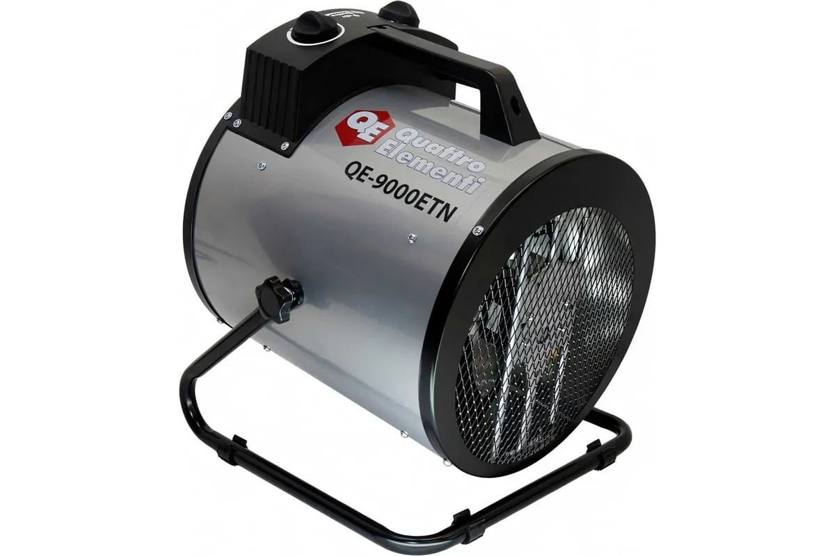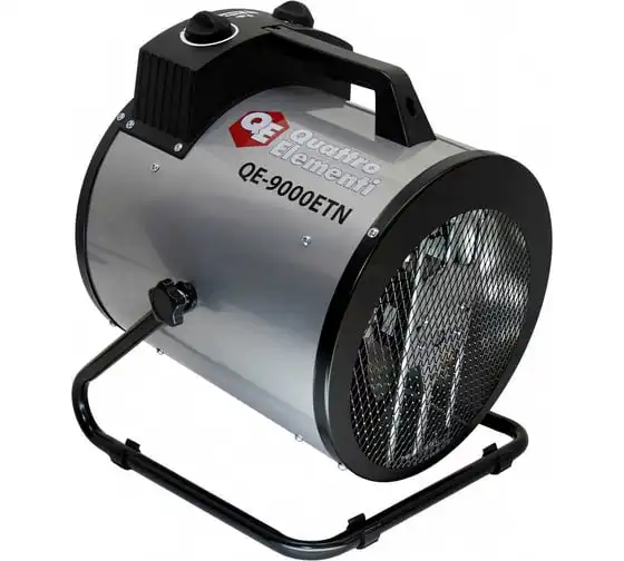 Электрическая тепловая пушка QUATTRO ELEMENTI QE-9000 ETN 649-288 работает от сети 380В. Данная модель имеет две ступени мощности нагрева 4500/9000 Вт, а также режим вентиляции без нагрева. Тепловая пушка оснащена трубчатым нагревательным элементом из нержавеющей стали. Для безопасности использования пушка имеет устройство автоматического отключения при перегреве. Оснащён сетевым проводом 1,2 м сечением 5х1,5 мм2. Для подключения к сети необходимо установить 3-х фазную сетевую вилку.