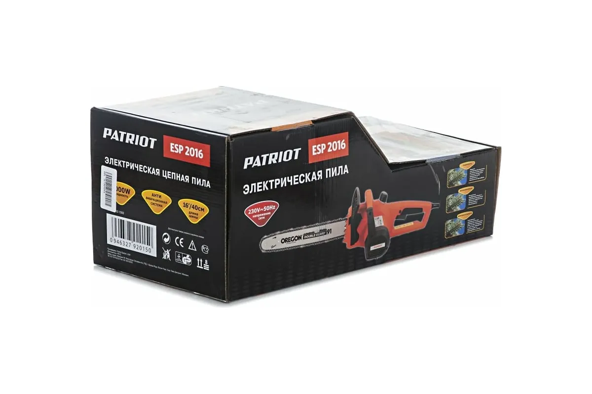 Электропила PATRIOT ESP 2016 220301550 - инструмент для бытового применения - для подрезания и распила деревьев. Легкий вес, низкий уровень вибрации и шума обеспечивают пользователю комфорт. Благодаря электродвигателю, эту пилу можно использовать в помещениях - не выделяются выхлопные газы, уровень шума невысок.