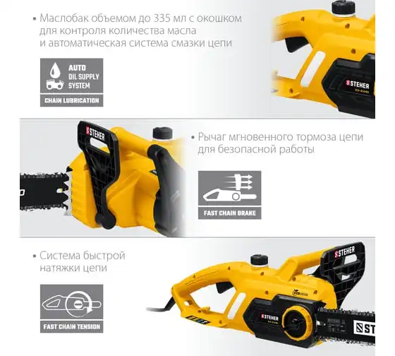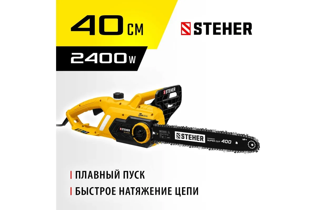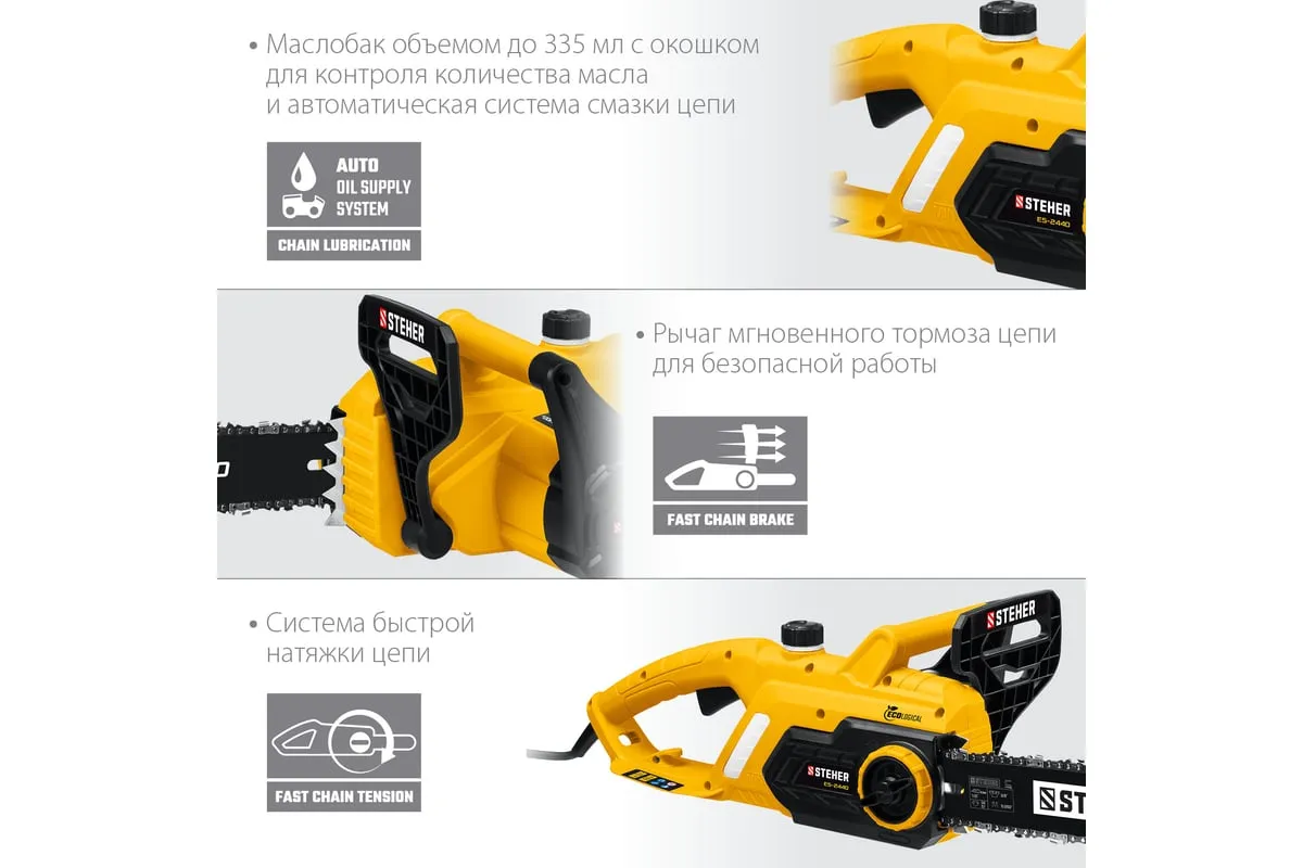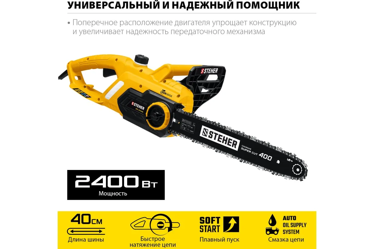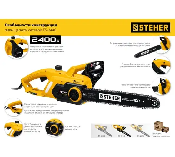 Электрическая цепная пила STEHER 2400 Вт ES-2440 применяется для валки деревьев, а так же пиления веток, обрезки сучьев, пиления деревянных балок, досок и тому подобное. Поперечное расположение двигателяупрощает конструкцию и увеличивает надежность передаточного механизма. Шина длиной 40 см позволяет распиливать заготовки большого диаметра. Основной тормоз мгновенного действияобеспечивает высокую безопасность работы. Система быстрого натяжения полотнаоблегчает трудоемкую операцию и способствует повышению производительности.