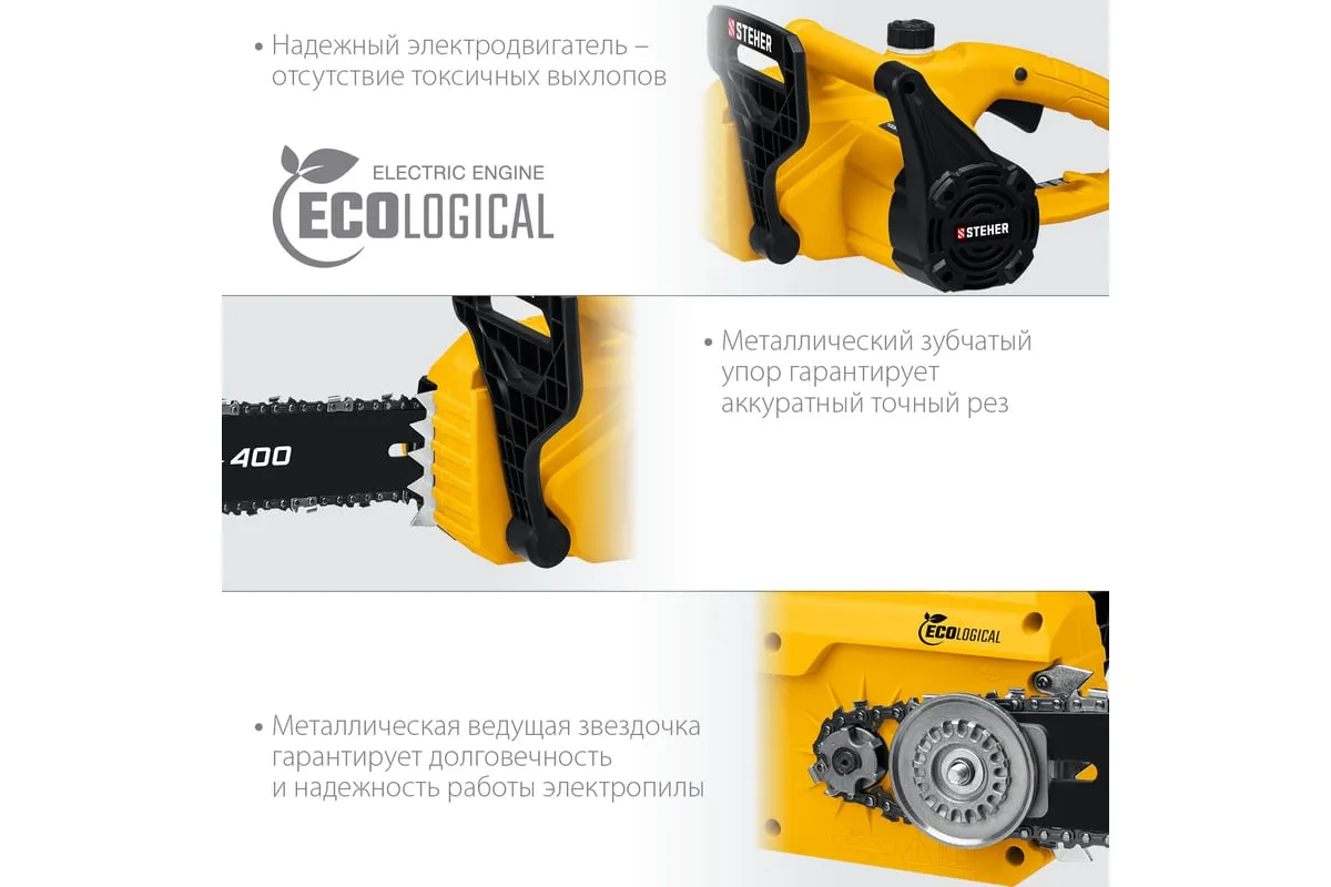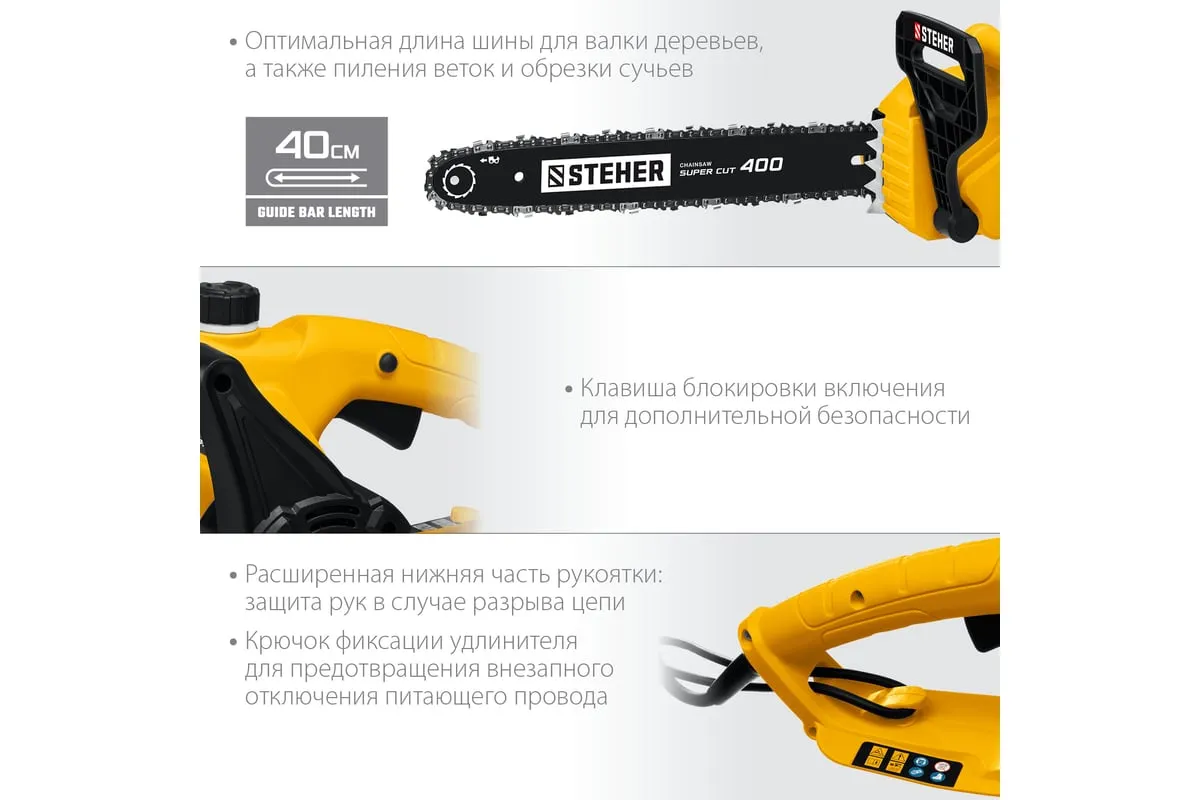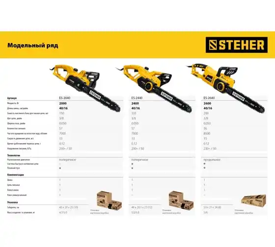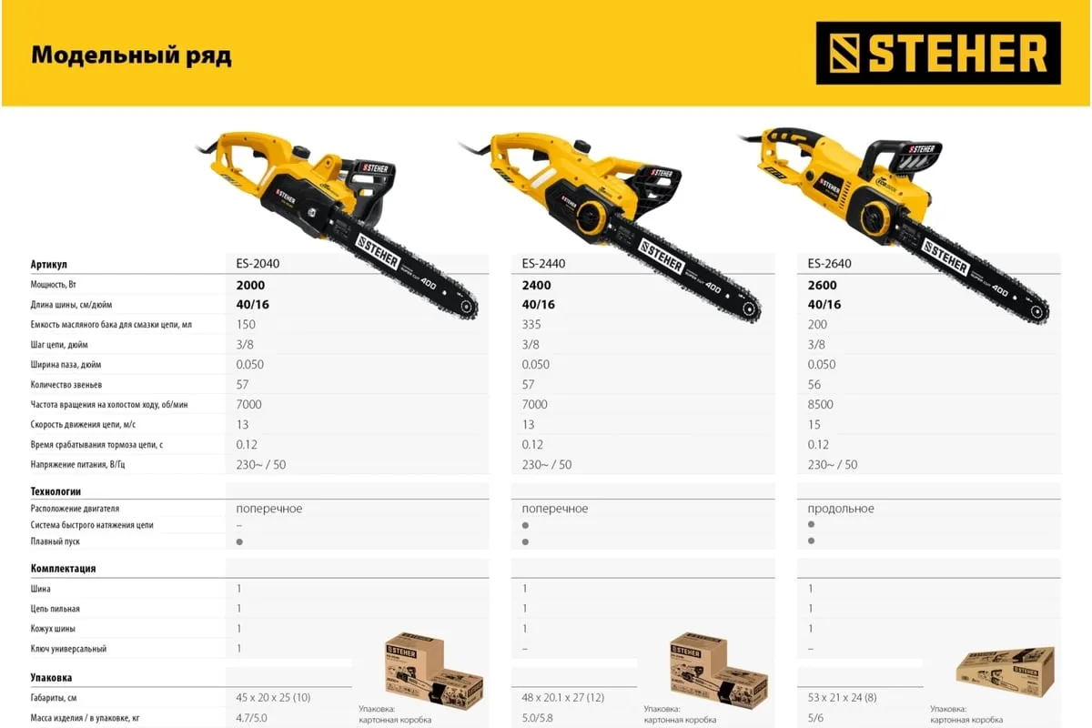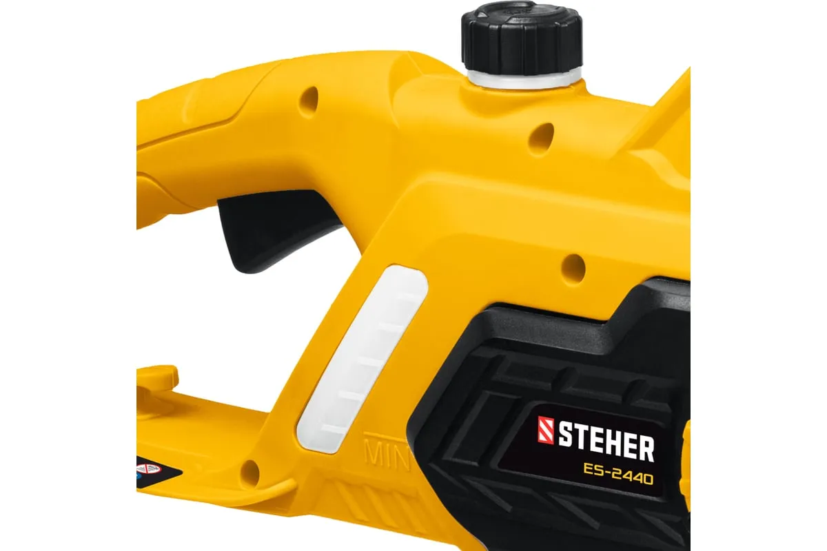 Электрическая цепная пила STEHER 2400 Вт ES-2440 применяется для валки деревьев, а так же пиления веток, обрезки сучьев, пиления деревянных балок, досок и тому подобное. Поперечное расположение двигателяупрощает конструкцию и увеличивает надежность передаточного механизма. Шина длиной 40 см позволяет распиливать заготовки большого диаметра. Основной тормоз мгновенного действияобеспечивает высокую безопасность работы. Система быстрого натяжения полотнаоблегчает трудоемкую операцию и способствует повышению производительности.