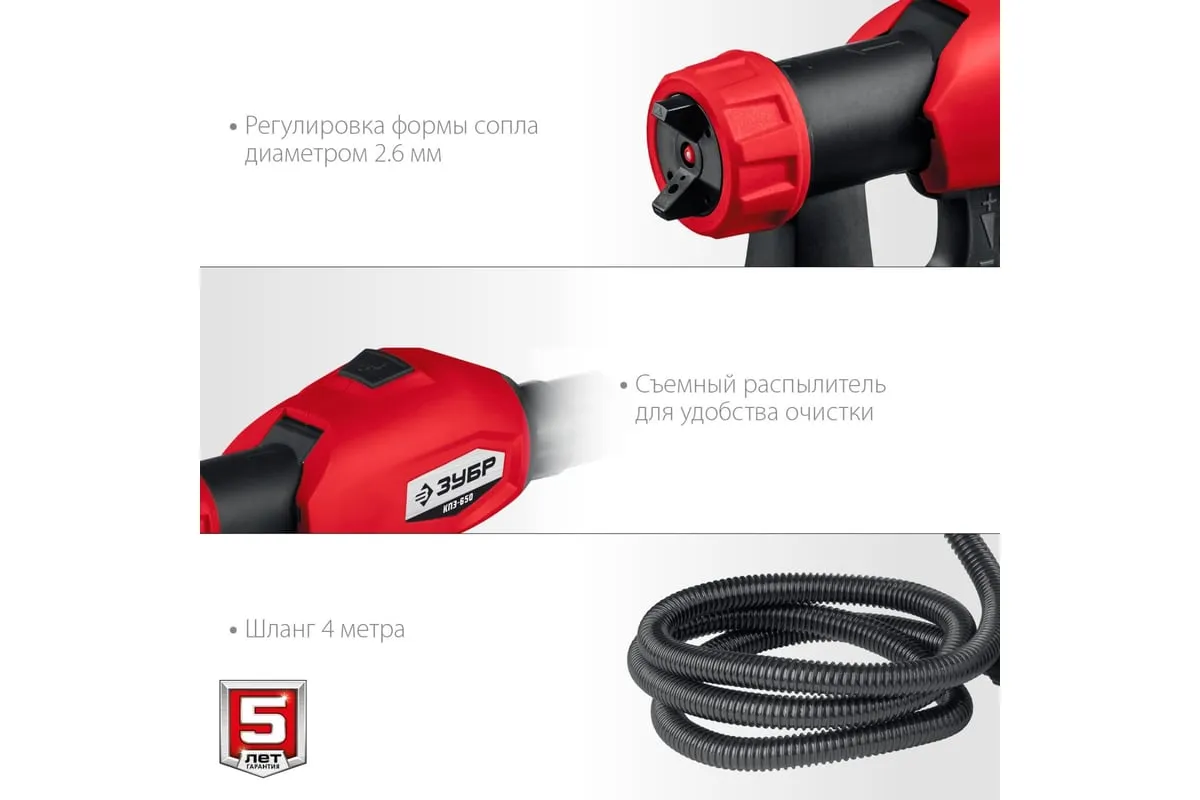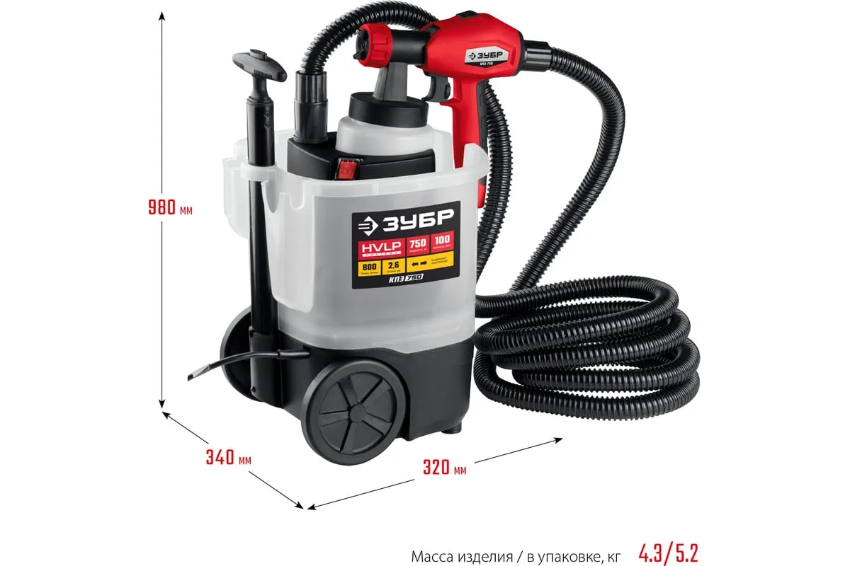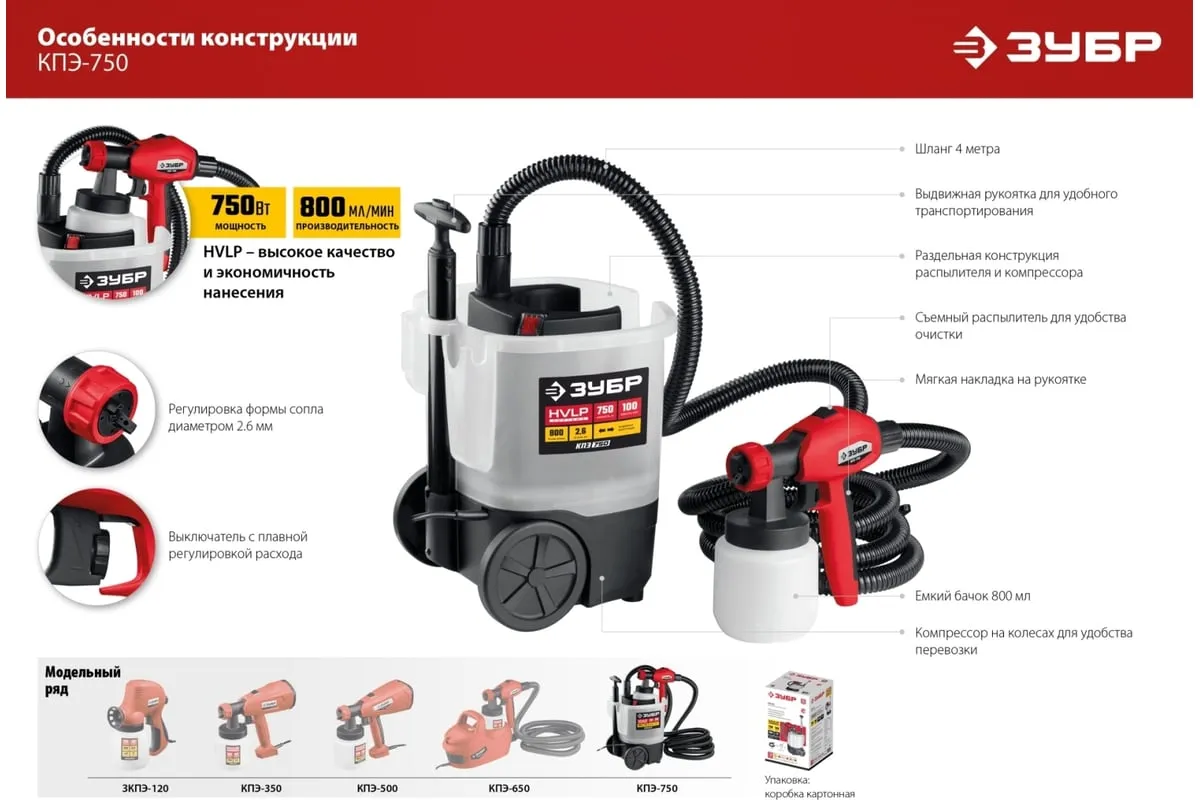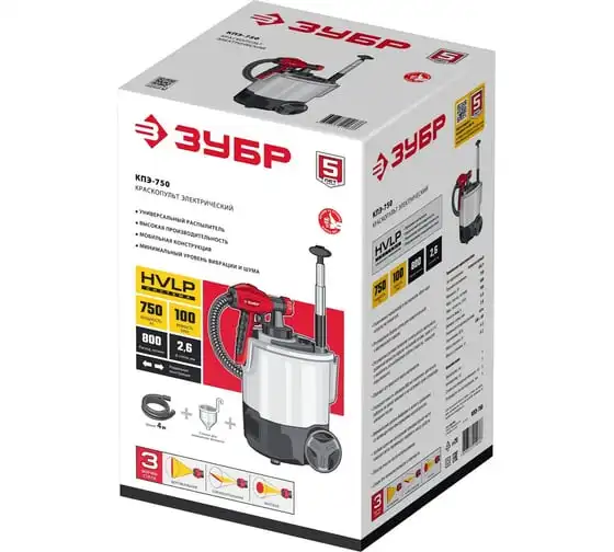 Электрический краскопульт ЗУБР 750 Вт КПЭ-750 оснащен соплом увеличенного диаметра, что обеспечивает высокую производительность. Благодаря системе HVLP, суть которой заключается в большом объеме при низком давлении, достигается точное и экономичное распыление.Разнесенные компрессор и распылитель снижают вес и вибрацию, приходящиеся на руки оператора, что делает его более удобным при покраске больших площадей и на высоте.