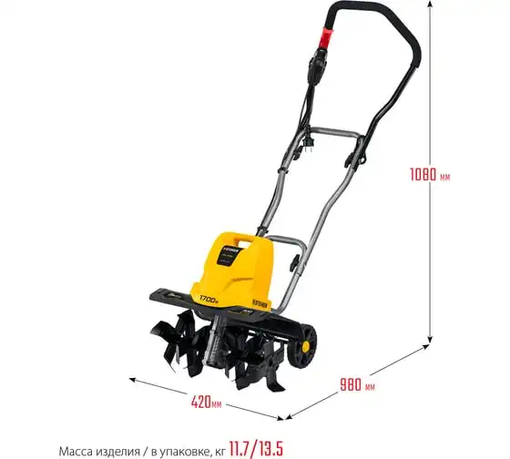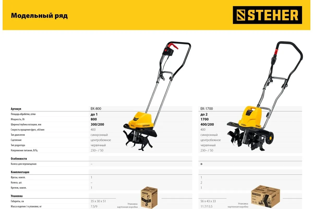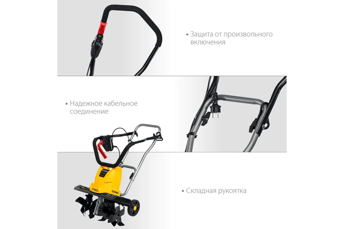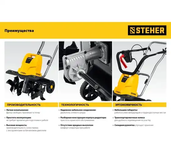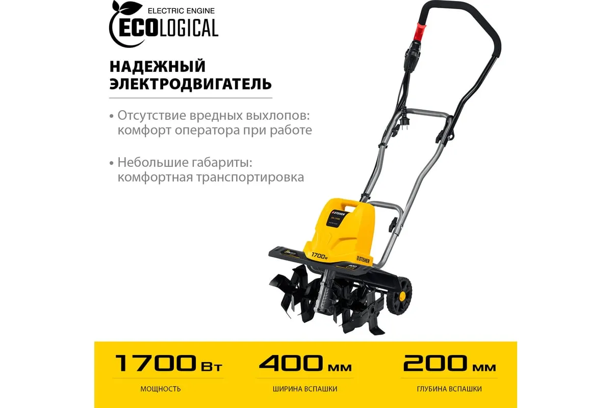 Электрический культиватор STEHER EK-1700 с синхронным двигателем мощностью 1700 Вт используетсядля рыхления и культивации почвына небольшом участках, парниках и теплицах. Оснащен металлическими фрезами с шириной захвата 40 см и обрабатывает почвуна глубину до 20 см.