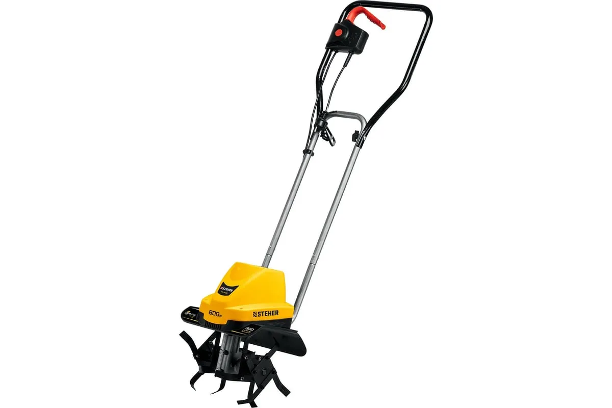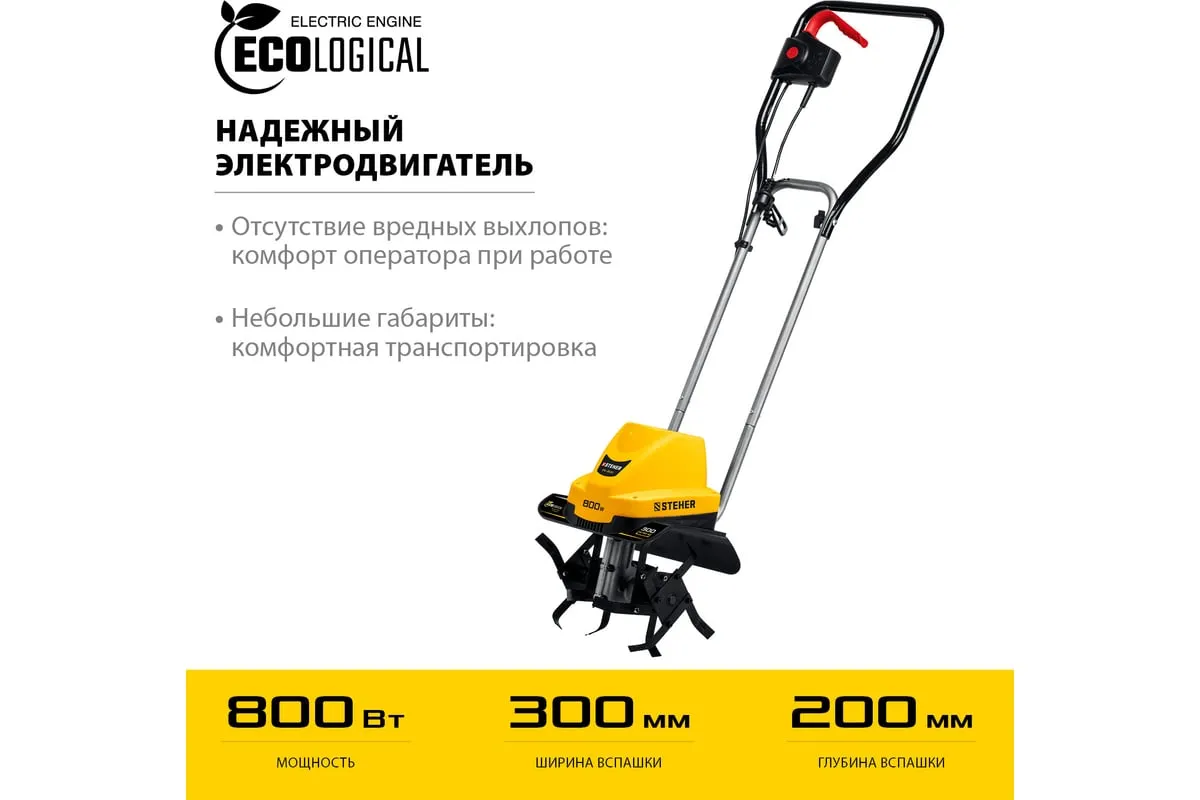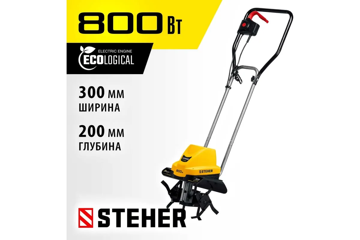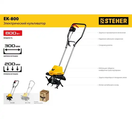 Электрический культиватор STEHER EK-800 предназначендля рыхления и культивации почвы на приусадебном участке. Оснащен металлическими фрезами с шириной захвата 30 см и обрабатывает почвуна глубину до 20 см. Благодаря малому весу с агрегатом могут работать женщины и пожилые люди.