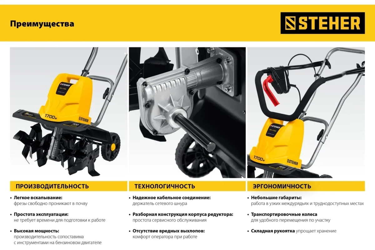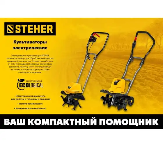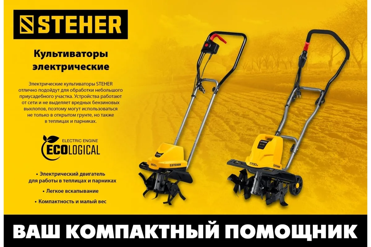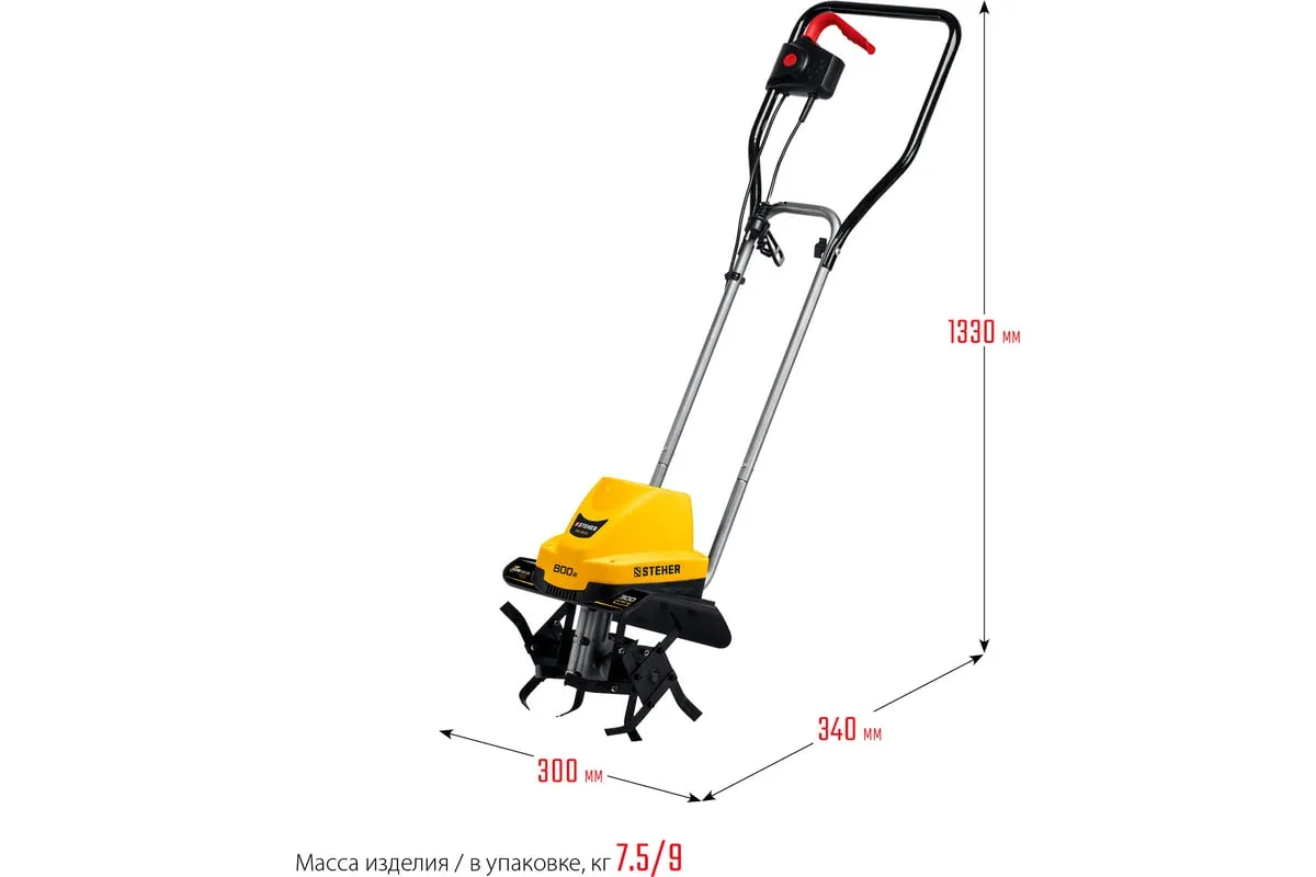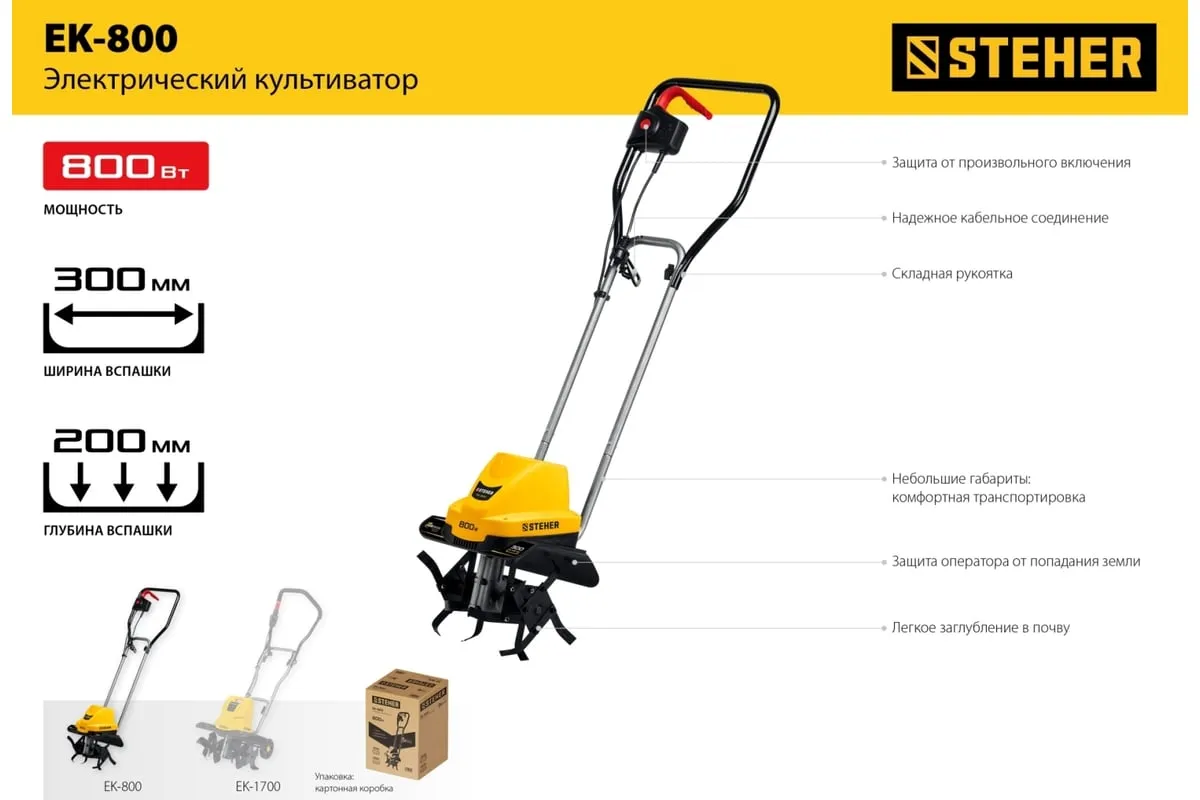 Электрический культиватор STEHER EK-800 предназначендля рыхления и культивации почвы на приусадебном участке. Оснащен металлическими фрезами с шириной захвата 30 см и обрабатывает почвуна глубину до 20 см. Благодаря малому весу с агрегатом могут работать женщины и пожилые люди.