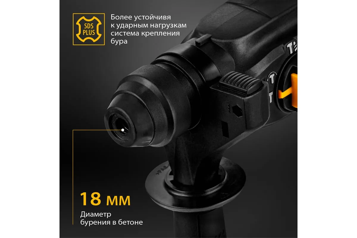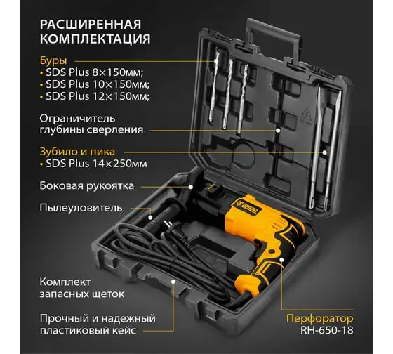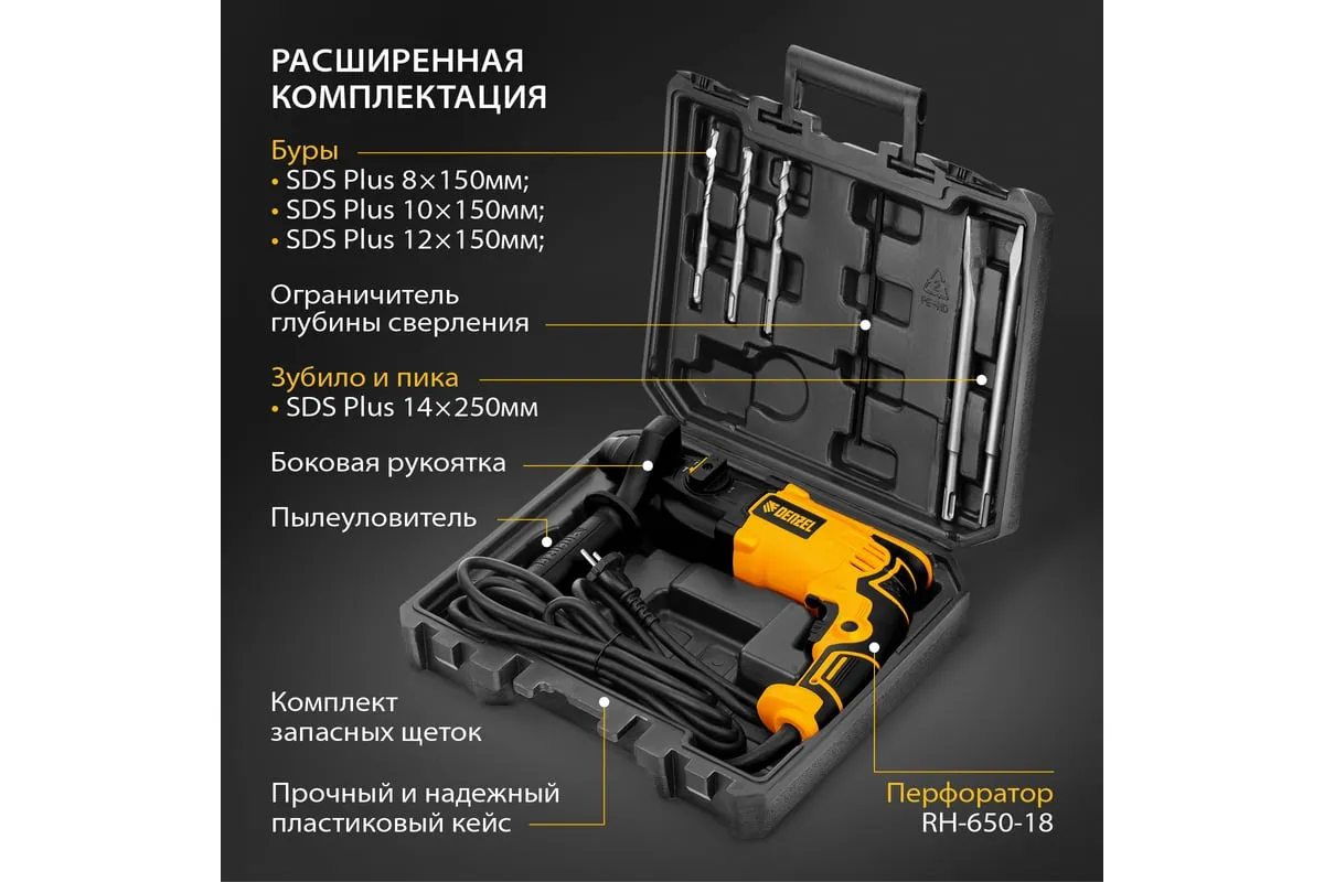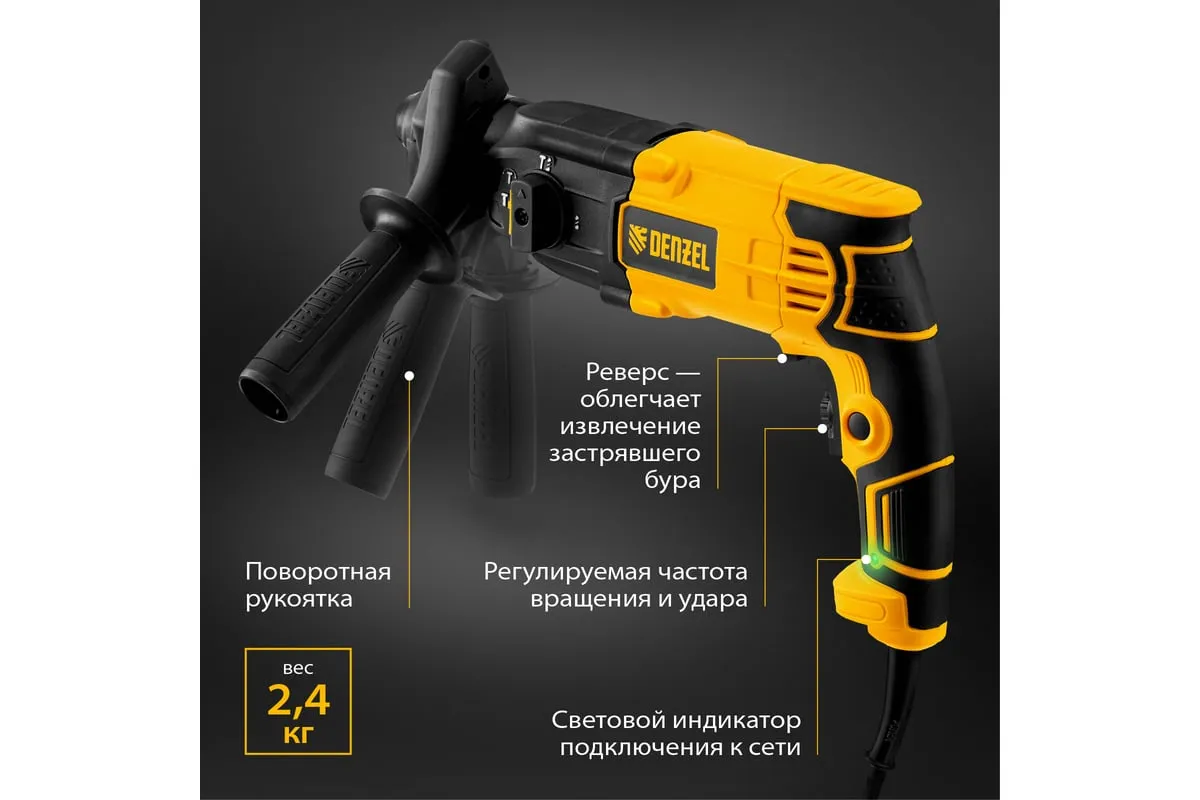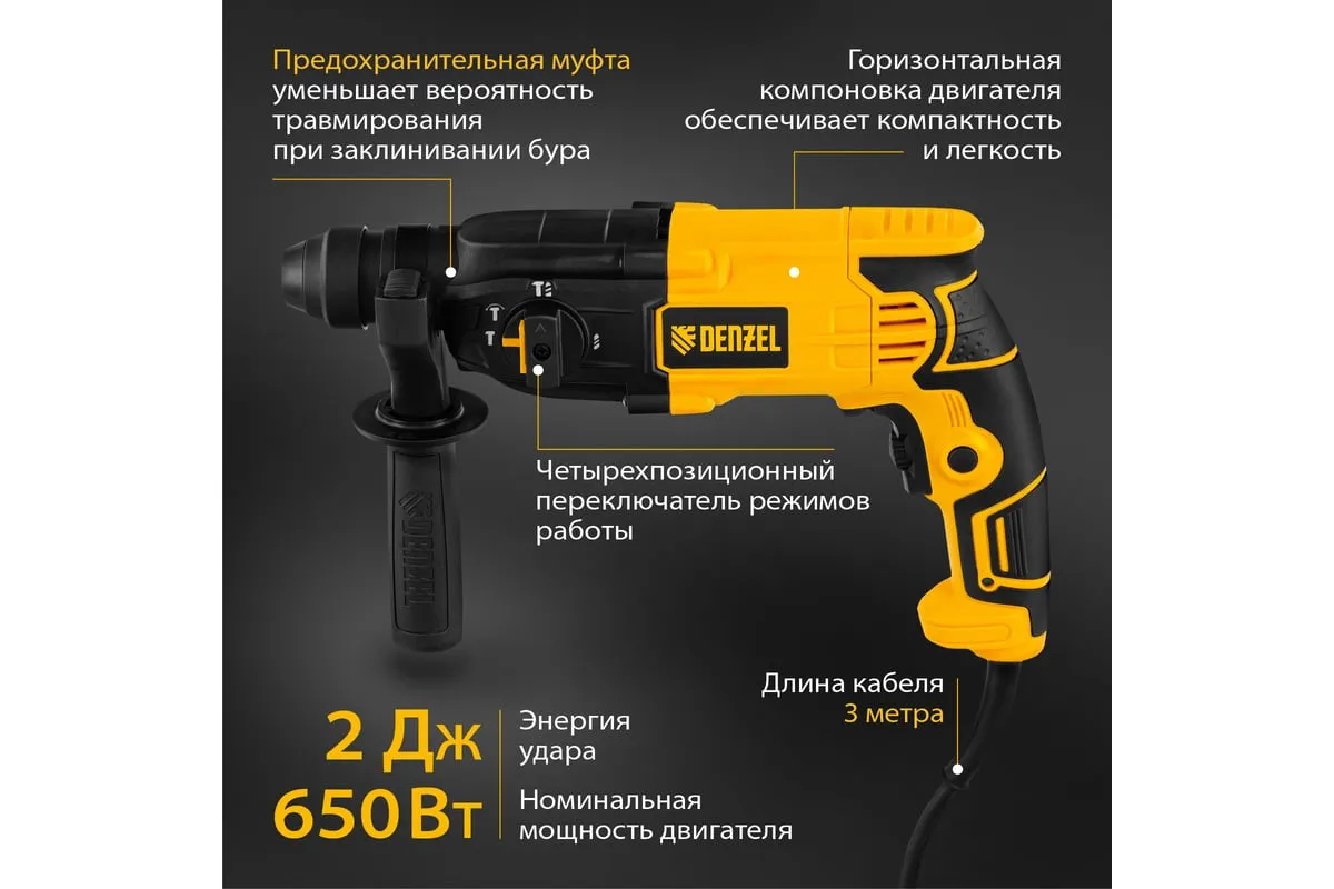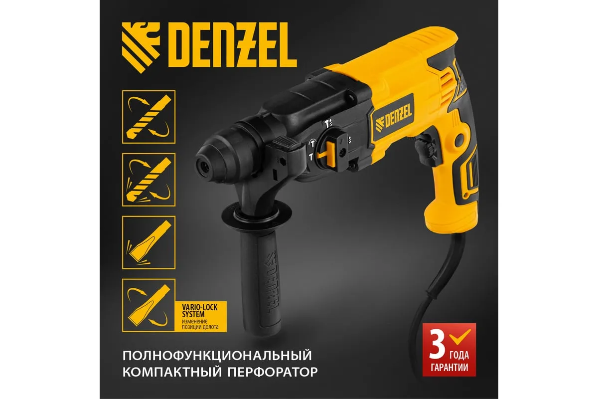 Электрический перфоратор DENZEL RH-650-18 26603 - самый компактная модель с 3 функциями.