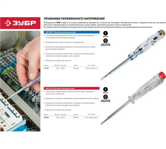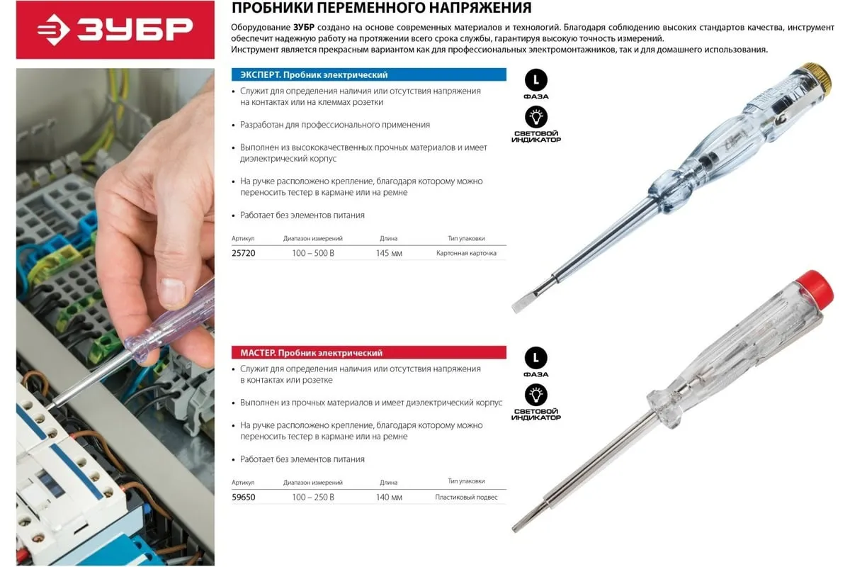 Электрический пробник 100-500В, 140мм Зубр 25720 изготовлен с использованием современных материалов и технологий с соблюдением высоких стандартов качества. Изделие обеспечивает надежный рабочий процесс в течение всего срока службы, гарантируя высокоточные показания измерений. Пробник подходит для бытового и профессионального использования в сфере электромонтажных работ. Пробник позволяет определить наличие или отсутствие напряжения в сети.