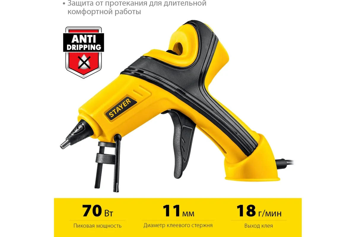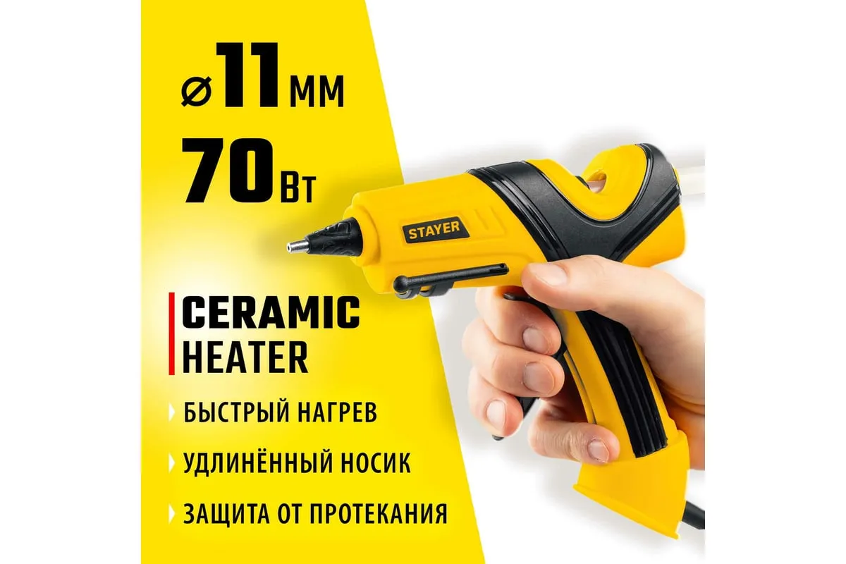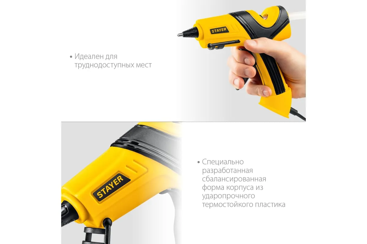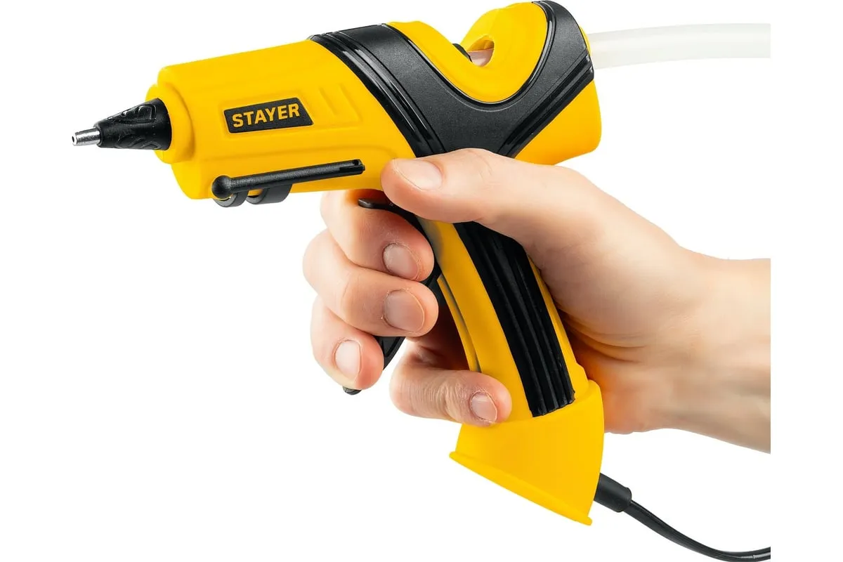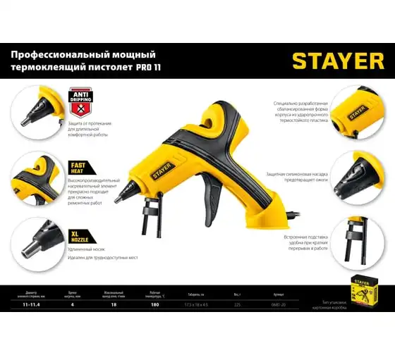 Электрический термоклеевой пистолет STAYER Pro 11 0681-20 - лучший выбор для профессиональных и бытовых работ в флористике, декорировании, изготовлении сувенирной продукции или детском творчестве.