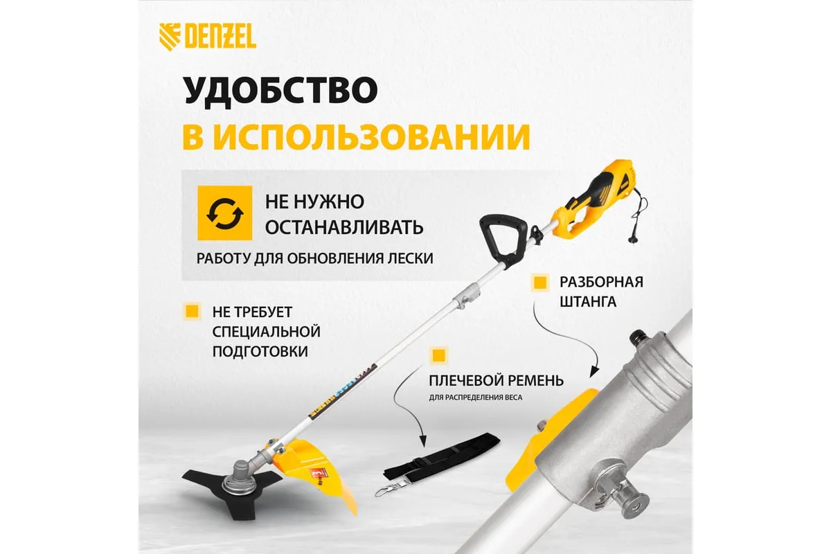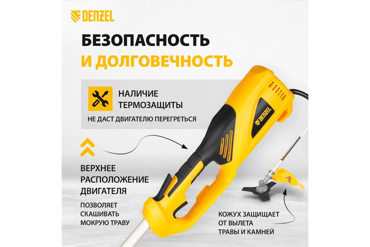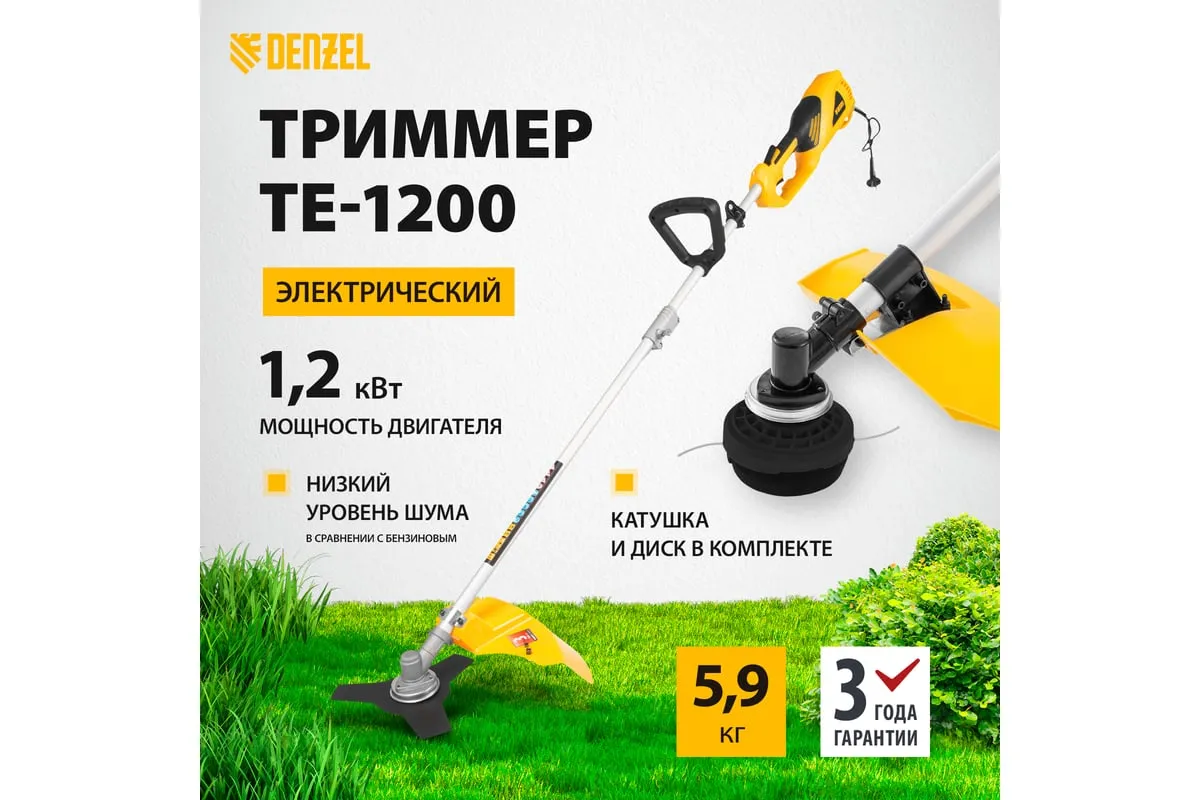 Электрический триммер DENZEL TE-1200 96611 предназначен для выкашивания травы в труднодоступных местах: вокруг деревьев, клумб, вдоль забора и т.д.