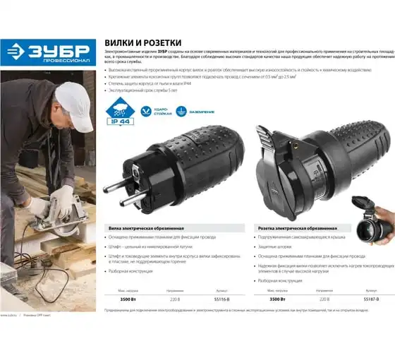 Розетка Зубр "ПРОФЕССИОНАЛ", электрическая, обрезиненная, 16А/250В, IP44, черная 55187-B