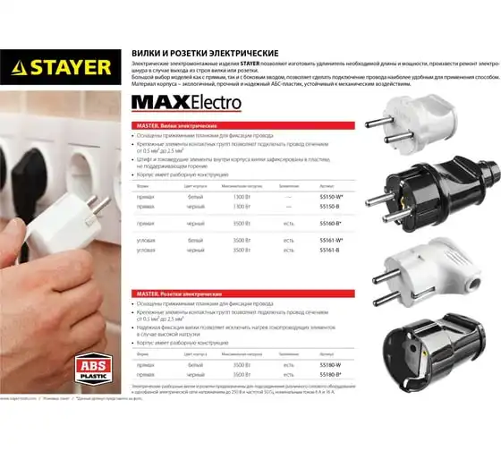 Вилка угловая белая STAYER, MAXElectro 16А/220 В, 1300 Вт 55161-W