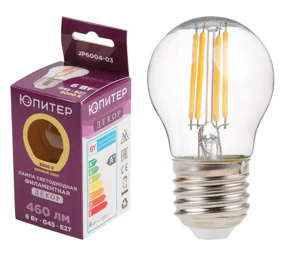 Светодиодная филаментная лампа ЮПИТЕР E27 G45 6 Вт 3000К JP6004-03