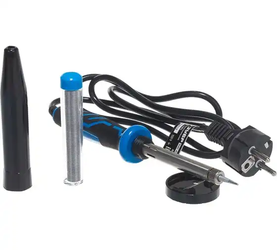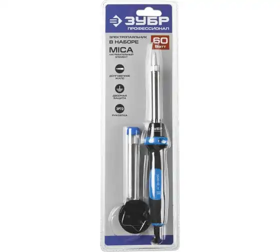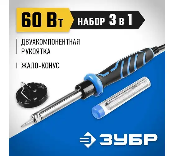 Электропаяльник ЗУБР Профессионал 60Вт, двухкомпонентная рукоятка, в наборе припой и подставка, 55402-60_z01