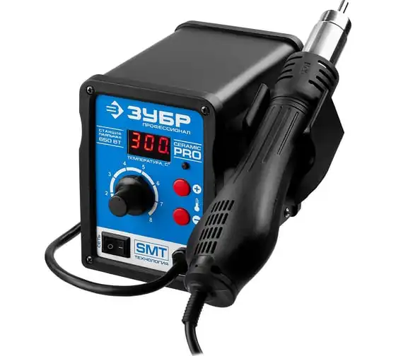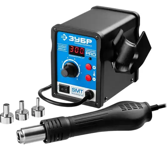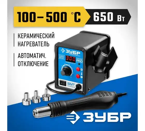 Термовоздушная цифровая паяльная станция ЗУБР 100-500C, шаг 1C, 120л/мин, 650Вт, 3 насадки 55350