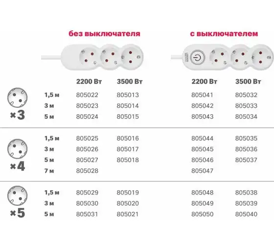 Удлинитель LEIDEN ELECTRIC 3 м 5 розеток 3,5 кВт с заземлением и выключателем 805039 ЦЗ-0547777536
