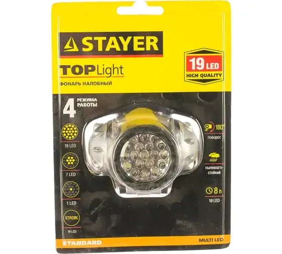 Налобный светодиодный фонарь 19LED, 4 режима, 3ААА STAYER STANDARD 56570