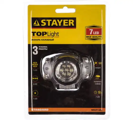 Налобный светодиодный фонарь STAYER STANDARD 7LED, 3 режима, 3ААА 56572