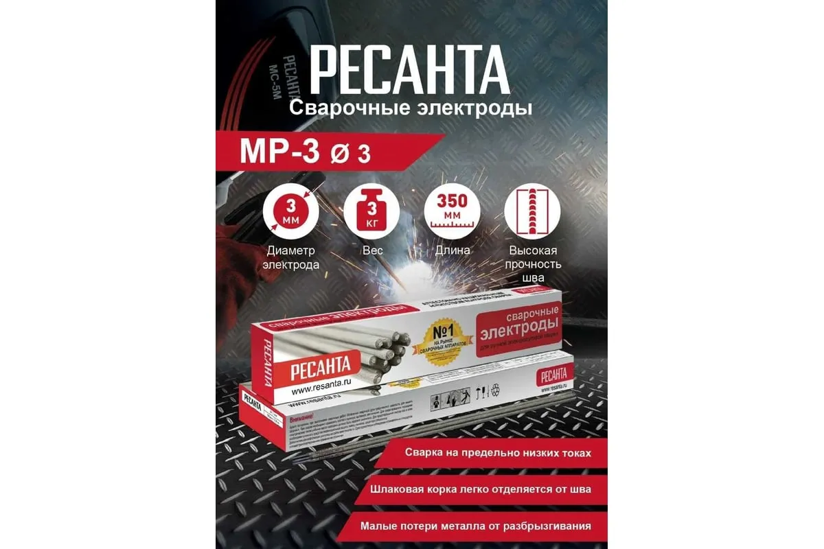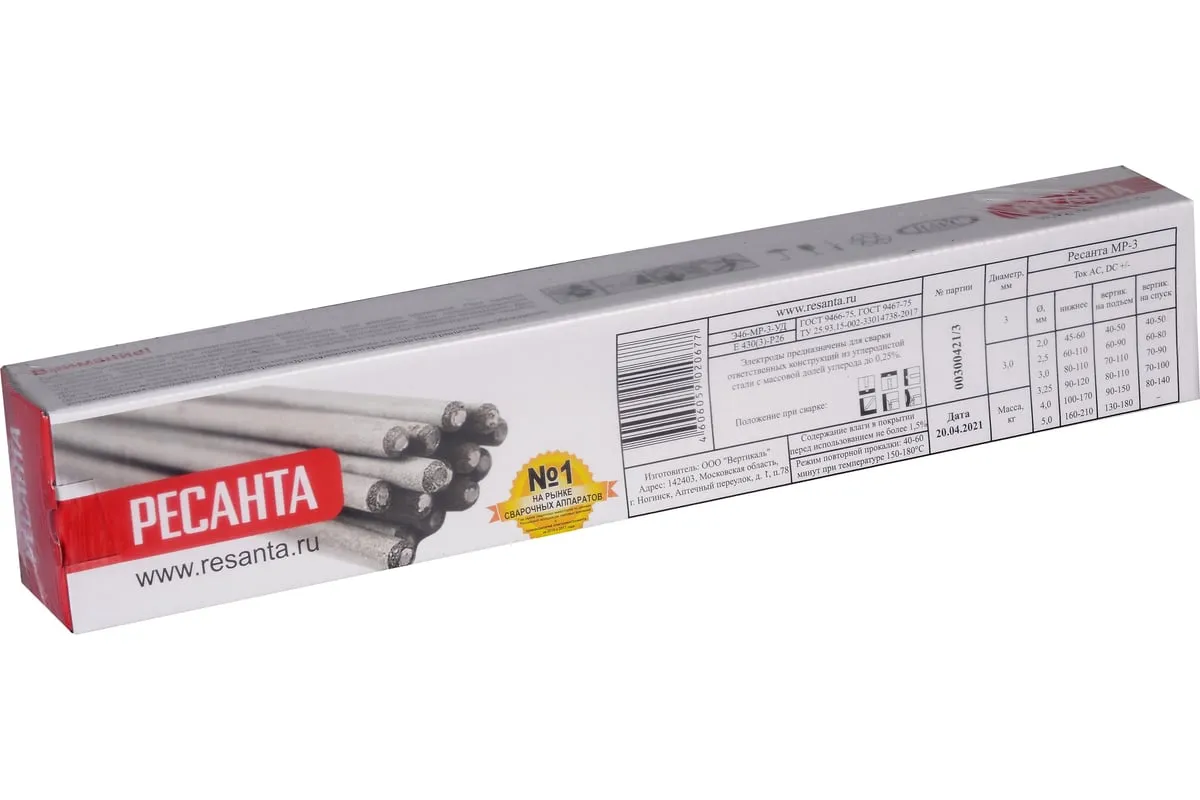 Сварочные электроды РЕСАНТА предназначены для ручной дуговой сварки стальных конструкций переменным или постоянным током. Данные электроды могут применяться как в быту, так и для сварки ответственных конструкций из углеродистой стали с массовой долей углерода до 0,25%. Сварка возможна в различных пространственных положениях, кроме сварки на спуск. Электроды РЕСАНТА относятся к высококачественным электродам типа МР-3 с рутиловым покрытием и изготовлены в соответствии с требованиям ГОСТ.