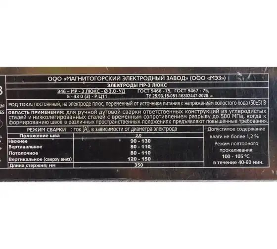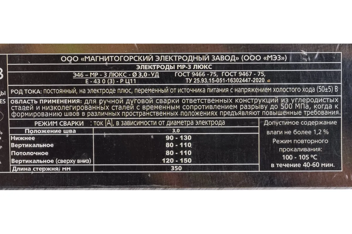 Электрод МР-3 ЛЮКС МЭЗЦ0035443 используетсядля ручной дуговой сварки ответственных конструкций из углеродистых и низколегированных сталей, с сопротивлением разрыву до 500 МПа. Подходит дляформирования швов с высокими требованиями.Работы проводятся на постоянном токе обратной полярности ина переменном токе.