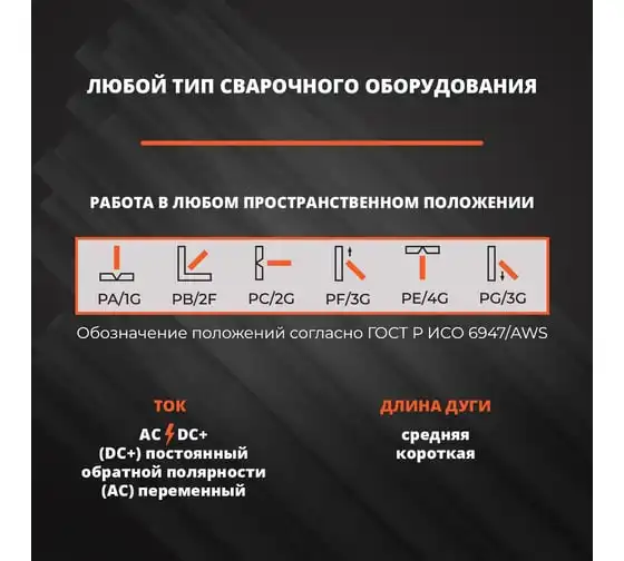 Электрод МР-3 ЛЮКС МЭЗ Ц0035427 используетсядля ручной дуговой сварки ответственных конструкций из углеродистых и низколегированных сталей, с сопротивлением разрыву до 500 МПа. Подходит дляформирования швов с высокими требованиями.Работы проводятся на постоянном токе обратной полярности ина переменном токе. Страна-производитель: Россия, Беларусь. Подходит для всех пространственных положений: Характеристики плавления электродов: Внимание,изображение товара может отличаться от реального! Верные параметры указаны в технических характеристиках товара.