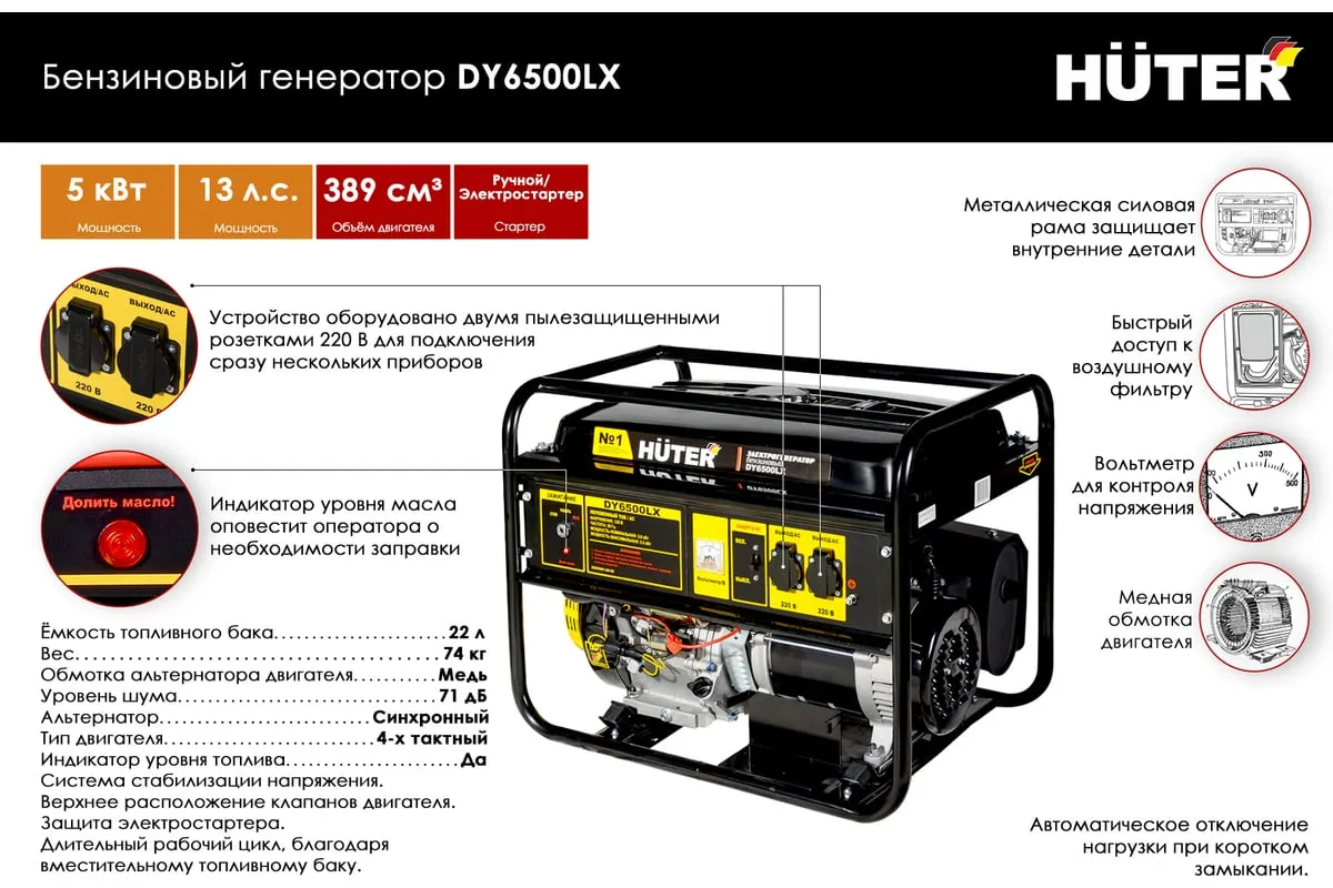 Надежная, удобная, производительная модель HUTER DY6500LX пригодится в загородном доме, на строительном, производственном, рабочем объекте для обеспечения оборудования электропитанием.