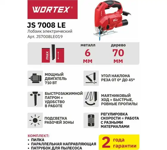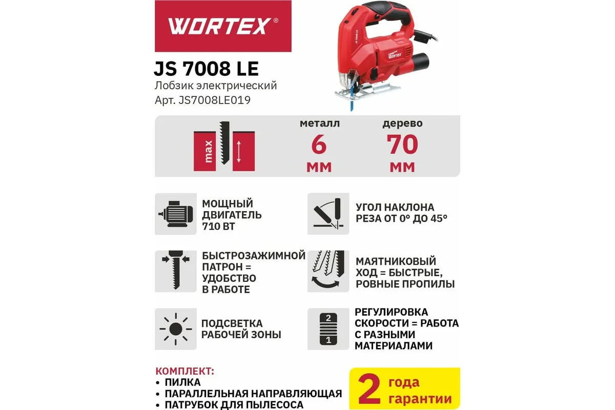 Электролобзик WORTEX JS 7008 LE JS7008LE019 оснащен удобной, эргономичной прорезиненной рукояткой.