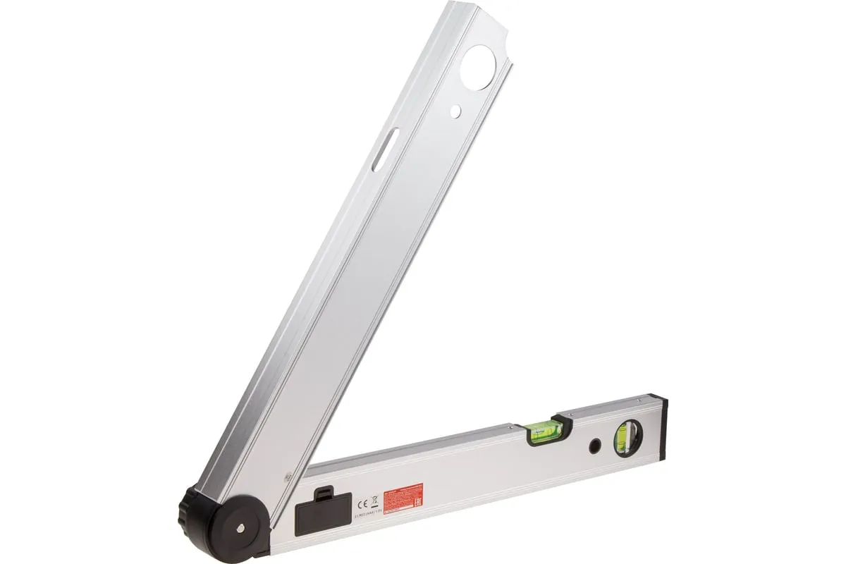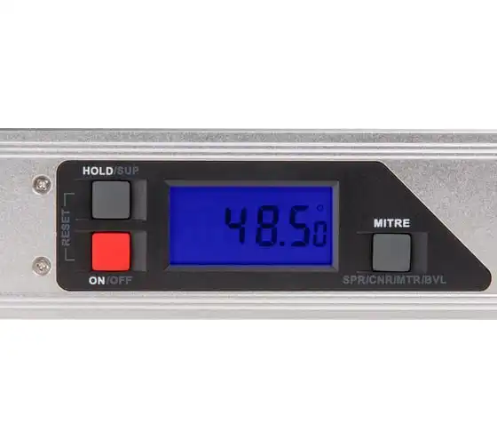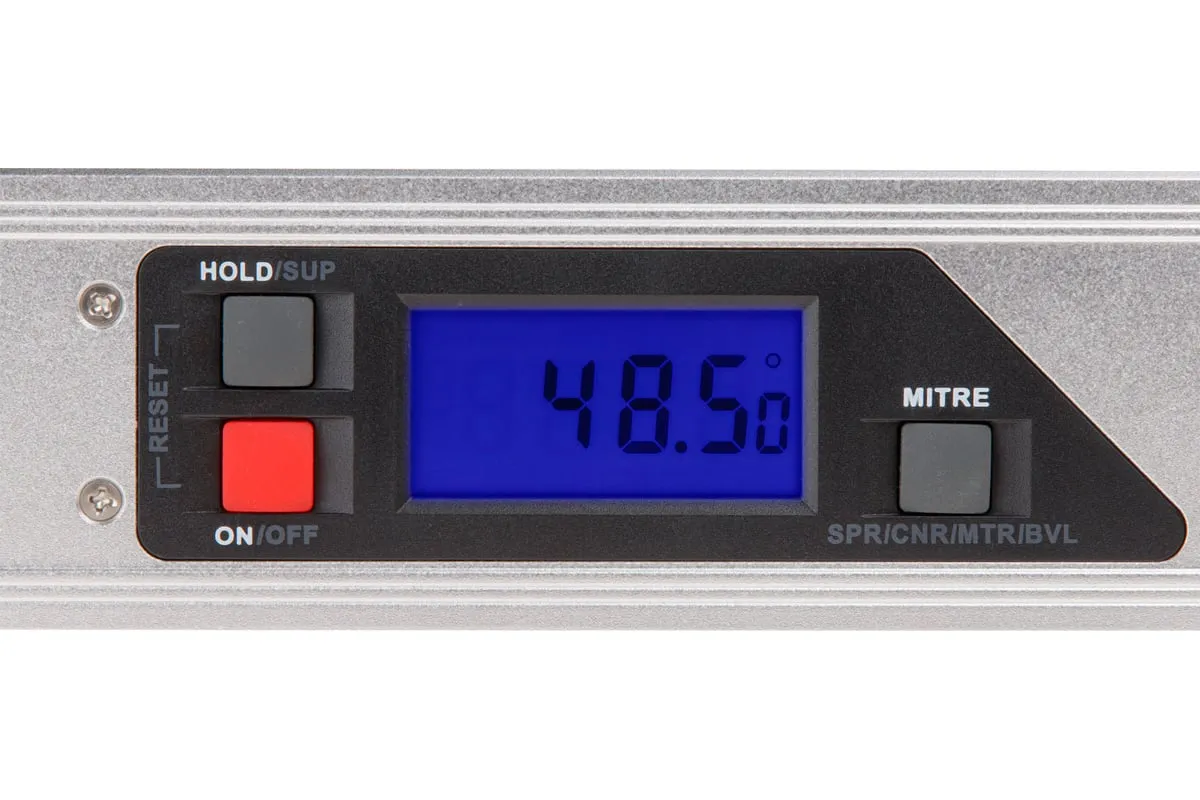Угломер оснащен ярким ЖК дисплеем с подсветкой (значения можно перевернуть нажатием одной кнопки), функцией памяти значений "HOLD", функцией быстрой калибровки (нажатие 2 клавиш), пузырьковыми уровнями. Инструмент поставляется в противоударном кейсе.