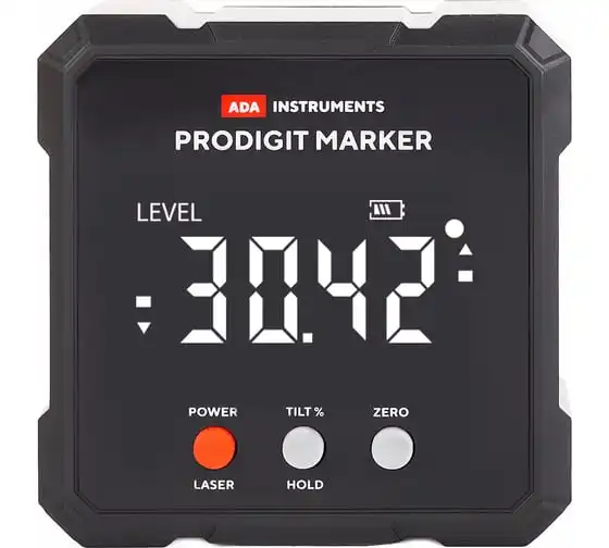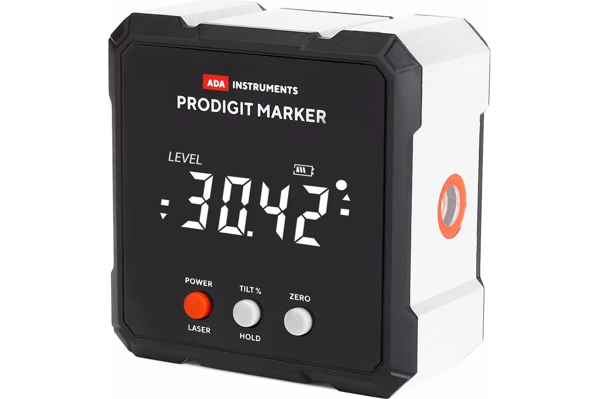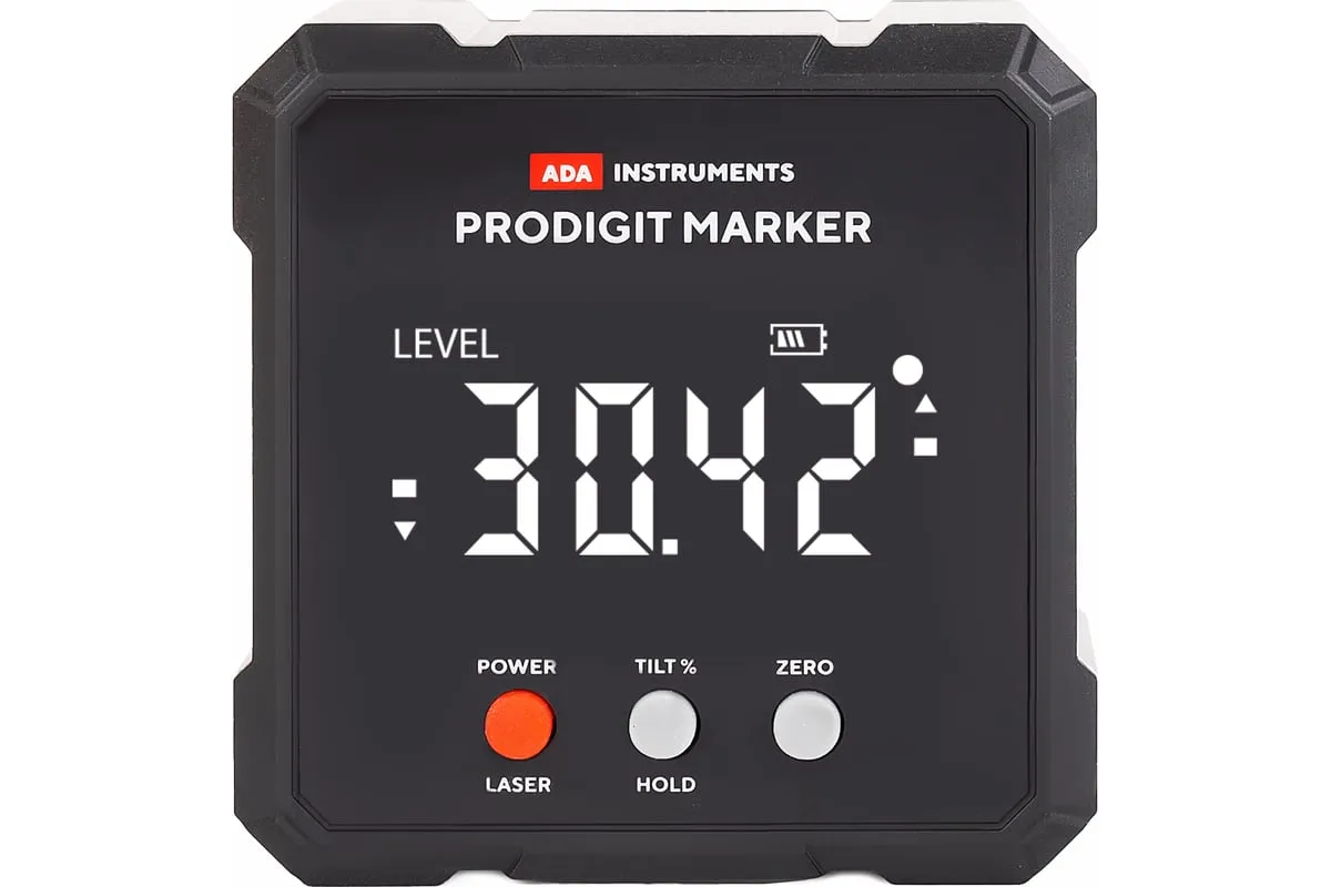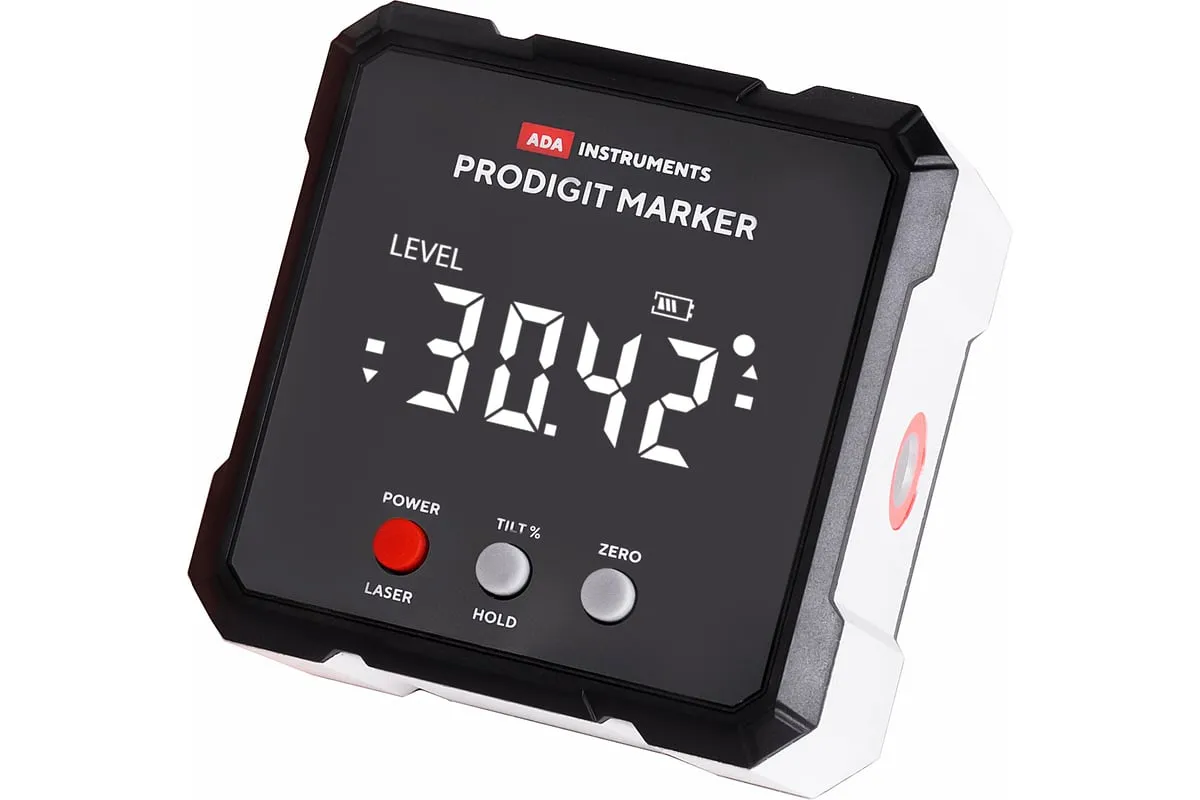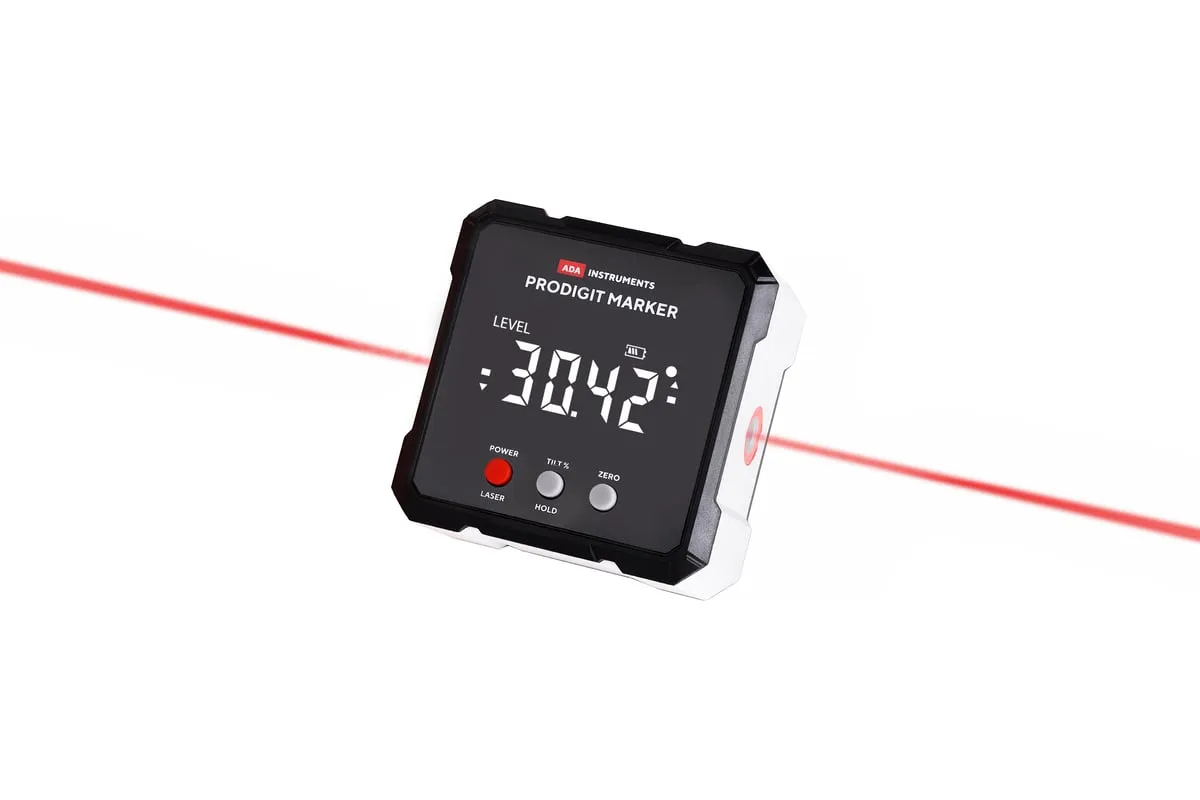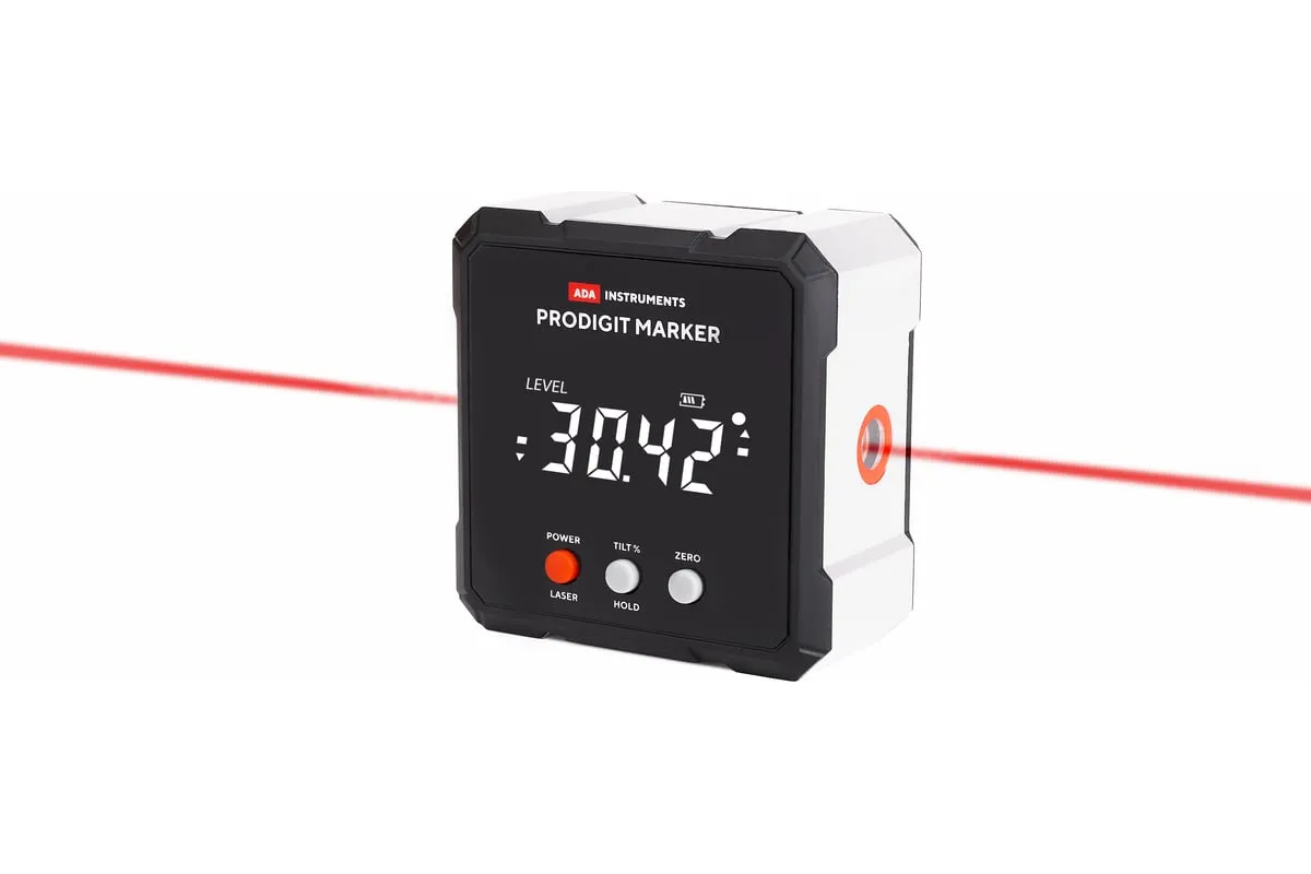 Электронный уровень с лазерным маркером ADA ProDigit MARKER А00671 позволяет быстро и точно определить угол отклонения поверхности от горизонта или вертикали.
