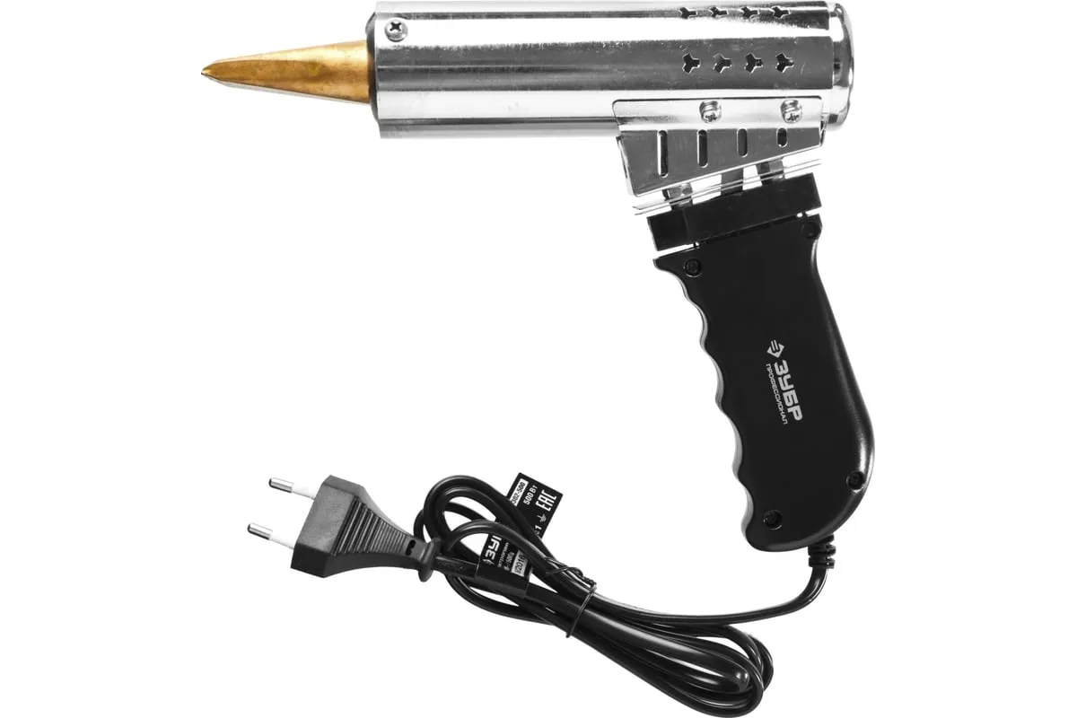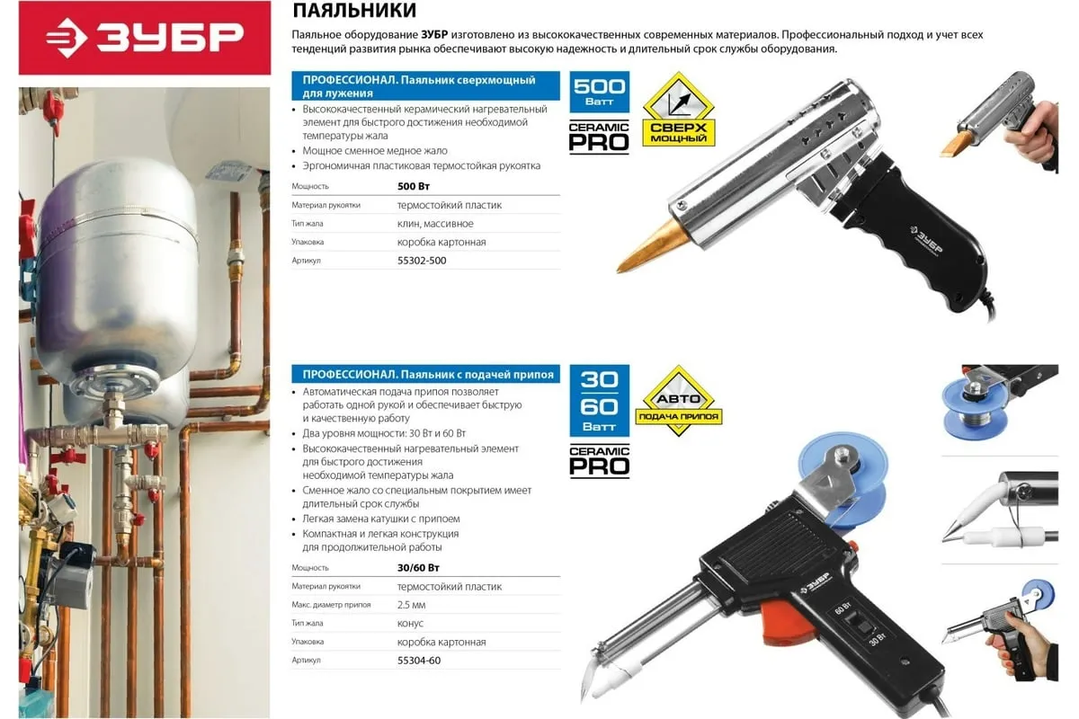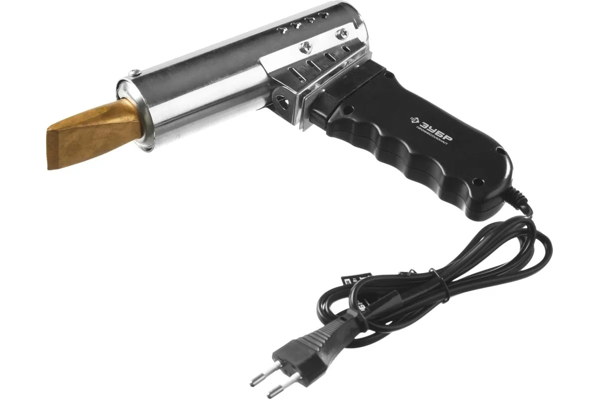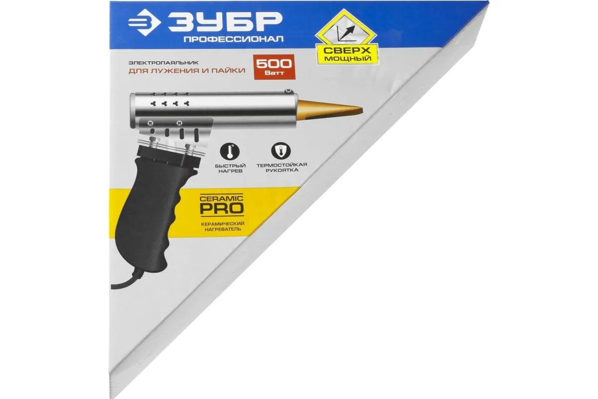 Электропаяльник Зубр ПРОФЕССИОНАЛ 500Вт, клин 55302-500 - очень мощный, высокопроизводительный прибор для пайки и лужения больших металлических элементов, таких как: медные трубы, радиаторы и т. д. Обеспечивает эффективный нагрев деталей. Подходит для проведения паяльных работ в области промышленности.