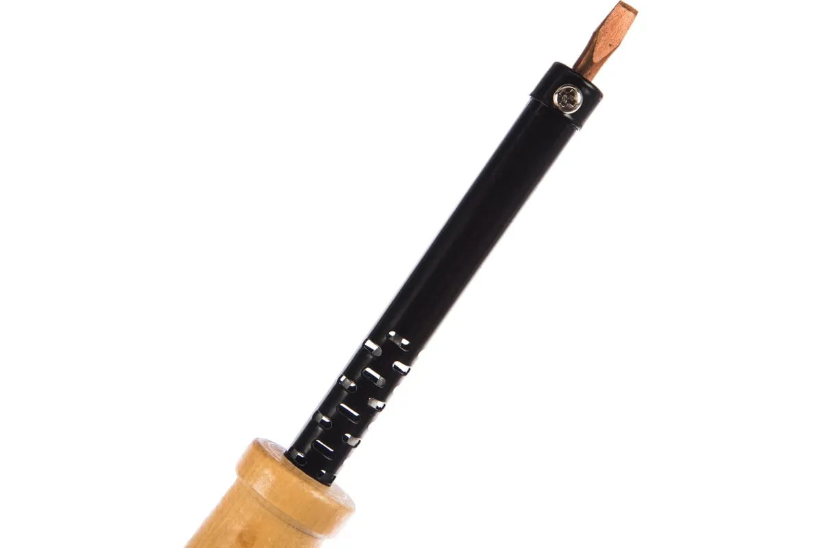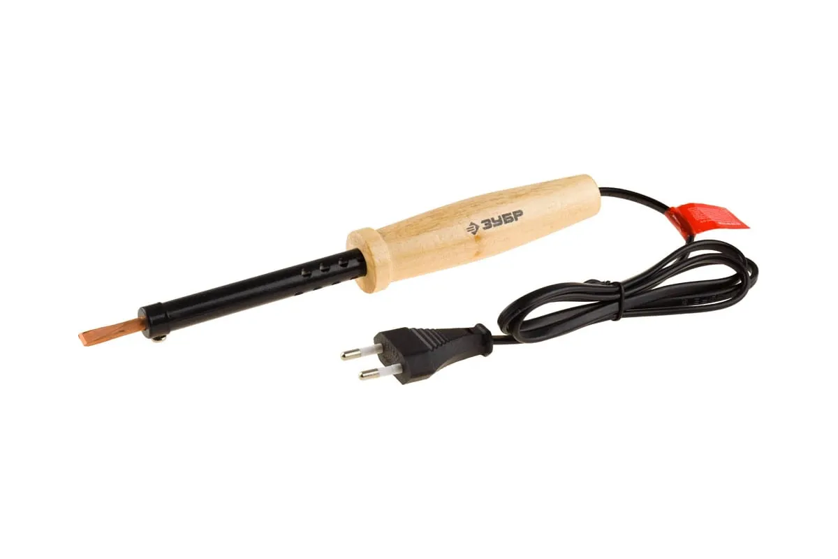 Электропаяльник ЗУБР с деревянной рукояткой, клин, 60Вт 55405-60 предназначен для монтажа электронных компонентов, пайки медных проводников сечением до 1.2 мм², отпайки, лужения металлических элементов толщиной до 0.5 мм. Рукоятка выполнена из дерева. Жало в форме клина выполнено из меди.