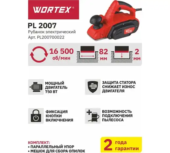 Электрорубанок WORTEX PL 2007 PL200700022 – простой и надежный инструмент, который прекрасно строгает и выравнивает поверхности, этому способствует регулировка глубины строгания и параллельный упор, идущий в комплекте.