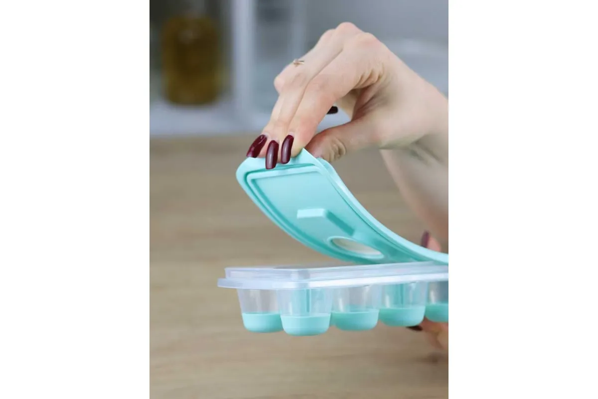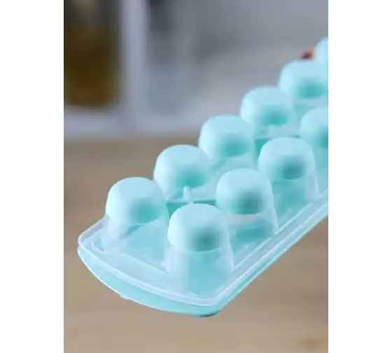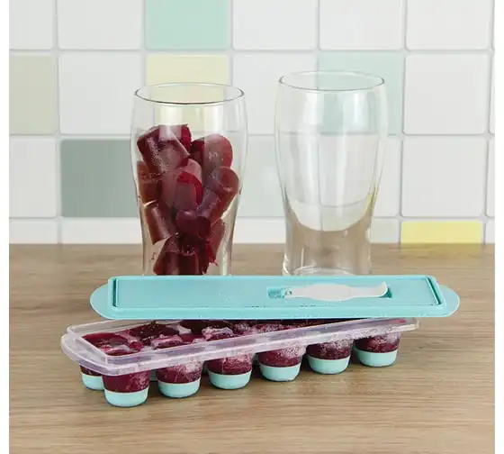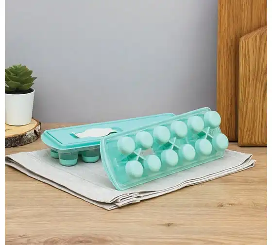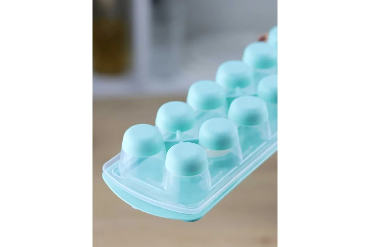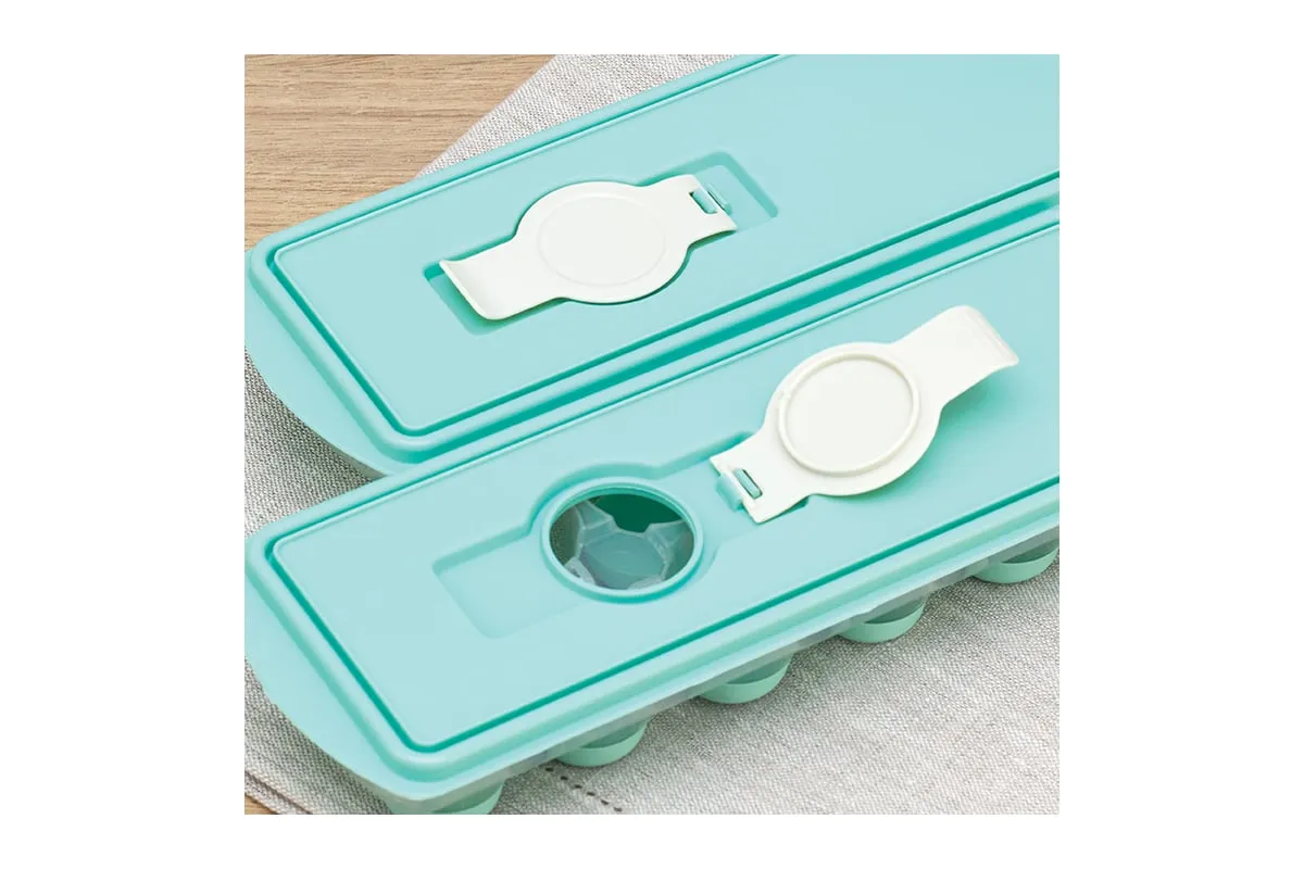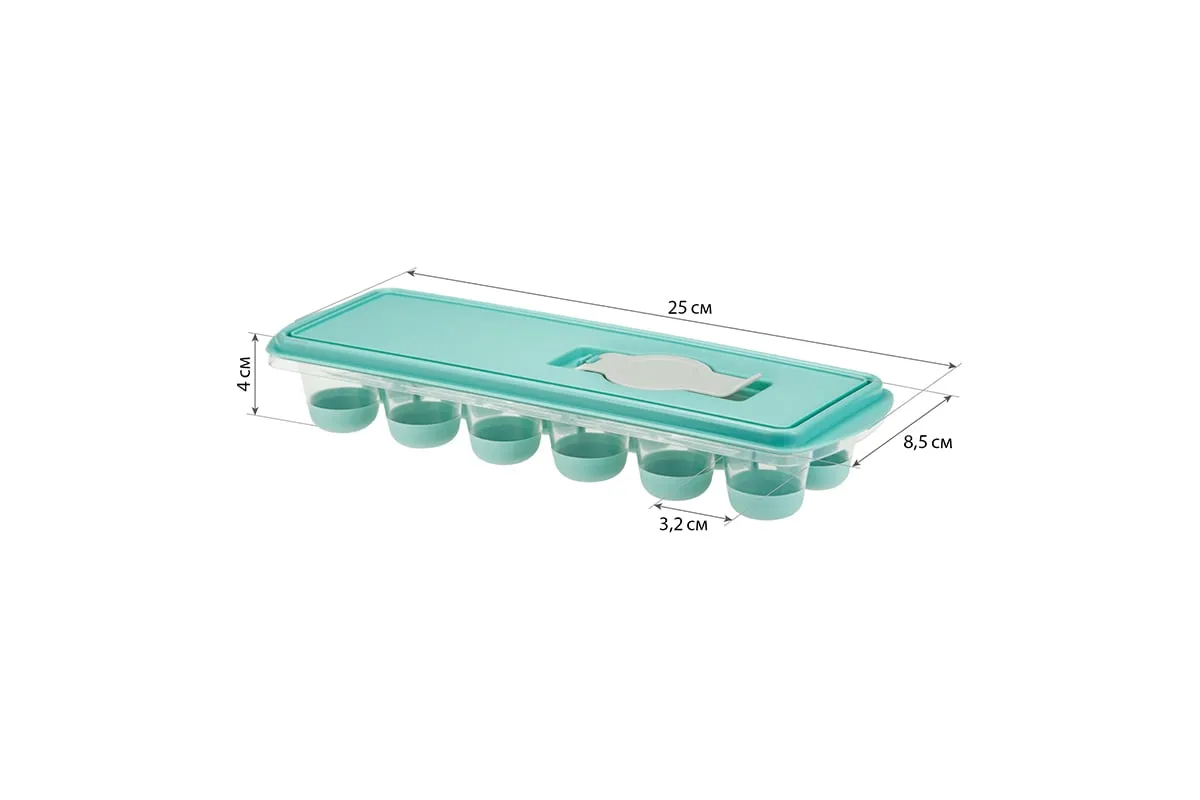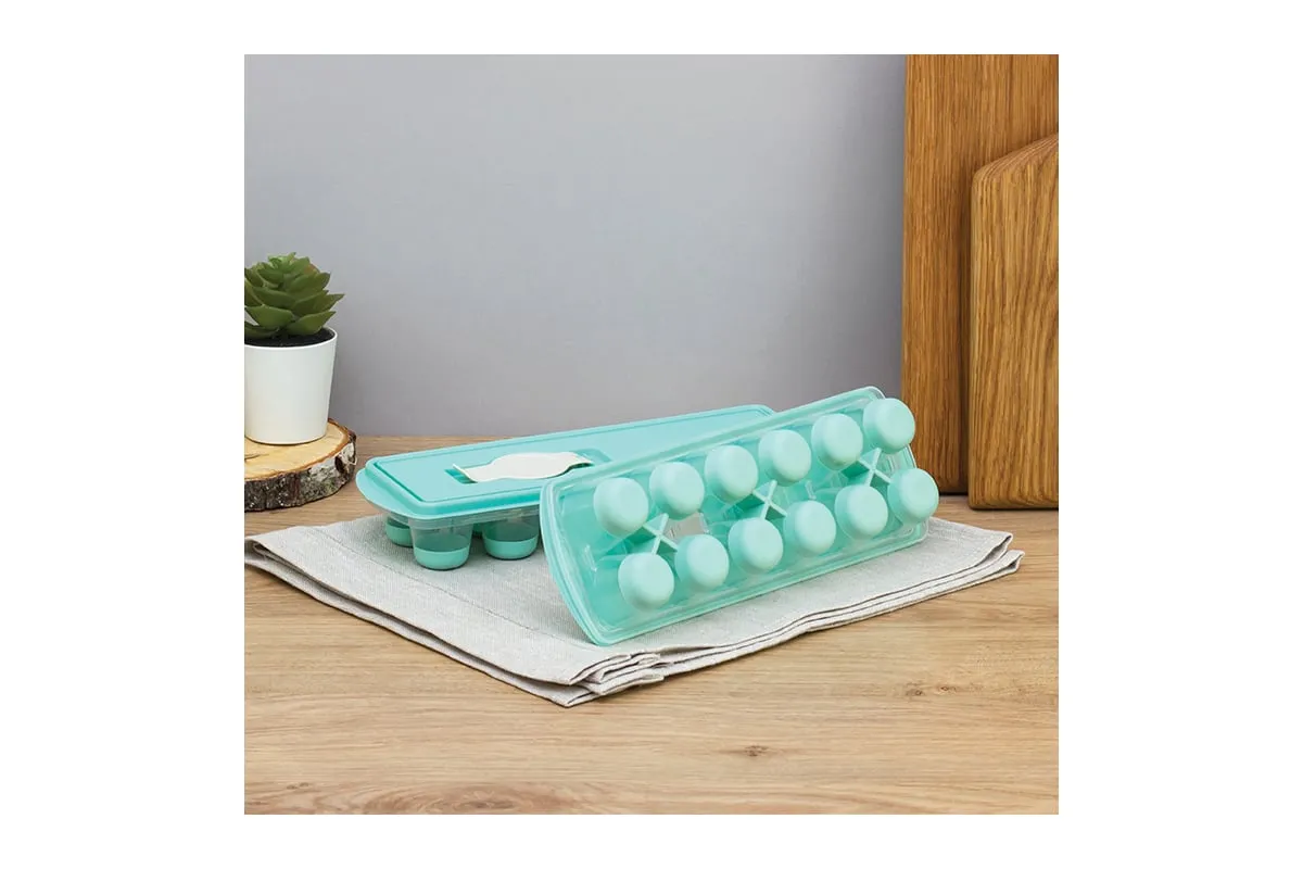 Форма для льда с крышкой и клапаном имеет эластичные вставки по дну формы, для удобного и комфортного извлечения льда. Благодаря этому можно одним движением извлекать замороженный лед из формы. Форма состоит из пищевого пластика. В ней можно замораживать воду, сок, мороженое, шоколад, а также фрукты. Форма имеет 12 ячеек размеры которых: Ø 3,2 × 2,5 см. После использования она легко моется (можно мыть в посудомоечной машине). Полиэтиленовая крышка удобна тем, что при низкой температуре она не теряет свою гибкость и ее легко снять. С помощью клапана можно налить воду в форму не снимая крышки и расплескать ее невозможно.