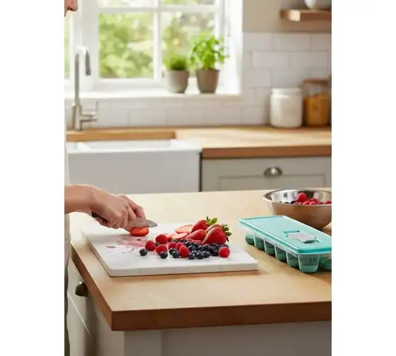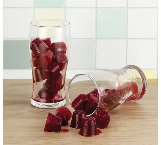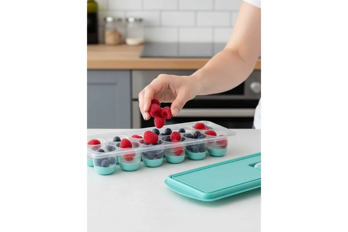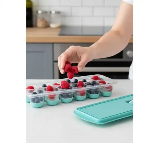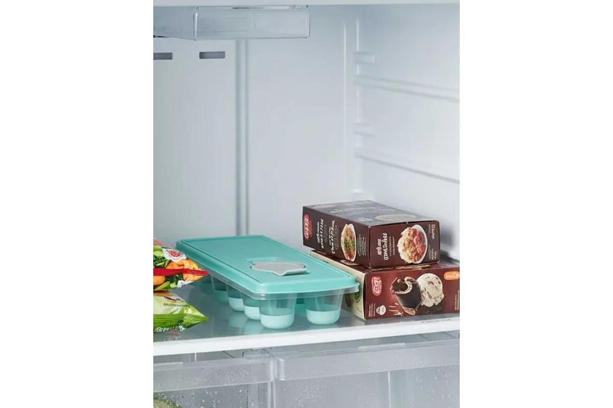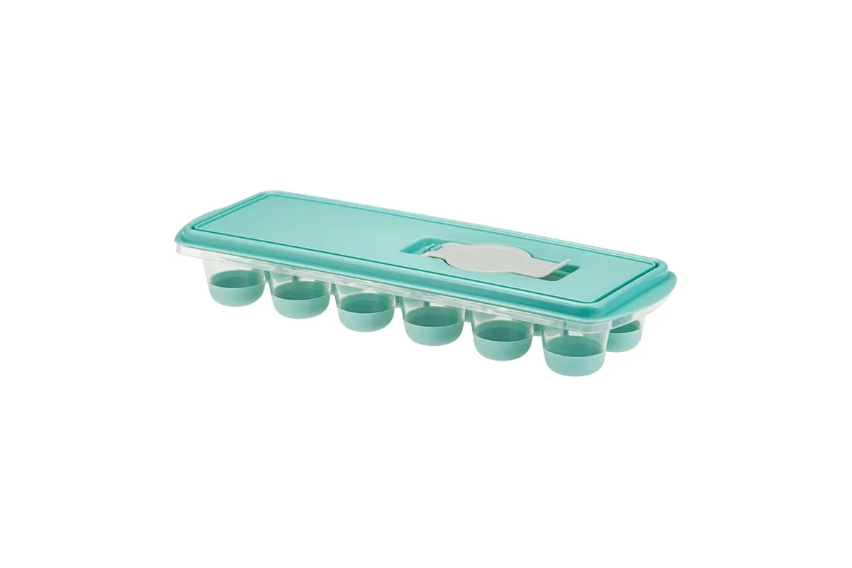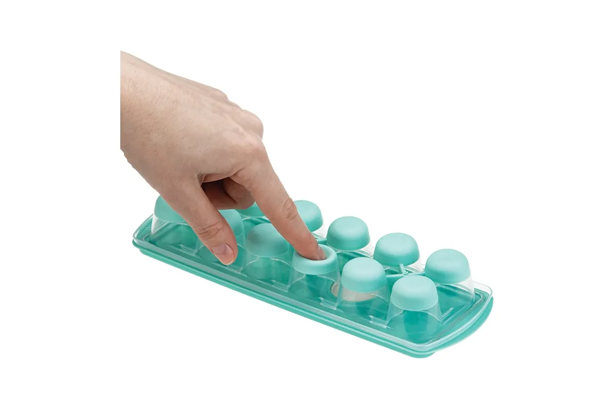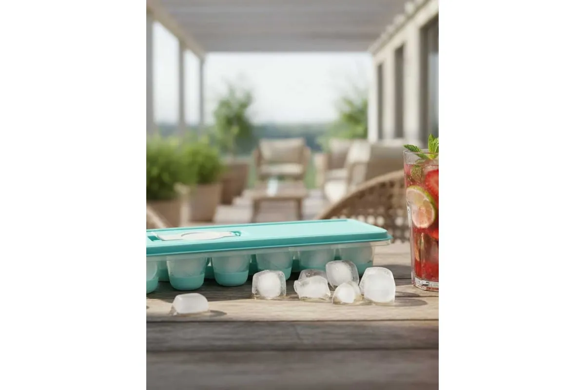 Форма для льда с крышкой и клапаном имеет эластичные вставки по дну формы, для удобного и комфортного извлечения льда. Благодаря этому можно одним движением извлекать замороженный лед из формы. Форма состоит из пищевого пластика. В ней можно замораживать воду, сок, мороженое, шоколад, а также фрукты. Форма имеет 12 ячеек размеры которых: Ø 3,2 × 2,5 см. После использования она легко моется (можно мыть в посудомоечной машине). Полиэтиленовая крышка удобна тем, что при низкой температуре она не теряет свою гибкость и ее легко снять. С помощью клапана можно налить воду в форму не снимая крышки и расплескать ее невозможно.