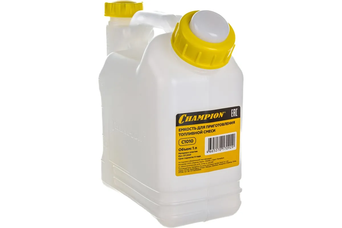 Емкость Champion C1010 предназначена для смешивания масла с бензином и дальнейшего его использования. Оснащена дозатором, в который заливается необходимое количество масла в соответствии с инструкцией для вашей бензотехники. В саму канистру заливается бензин и все тщательно перемешивается. Носик для удобной заливки поставляется в комплекте.