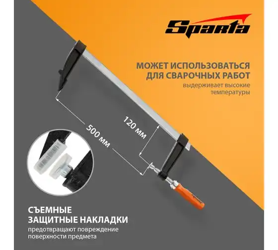 F-образная струбцина Sparta 204415, 500 х 120 х 570 мм, используется в столярном и слесарном деле и позволяет фиксировать заготовки из металла, древесины и других материалов для их соединения или обработки. Деталь помещают между губками, одна из которых подвижна и служит для регулировки величины захвата. Винтовой зажим позволяет прикладывать значительное усилие для надежности фиксации. Защитные накладки предотвращают повреждение детали. Элементы конструкции выдерживают высокую температуру, поэтому струбцина подходит для проведения сварочных работ, при этом пластиковые накладки необходимо снять.