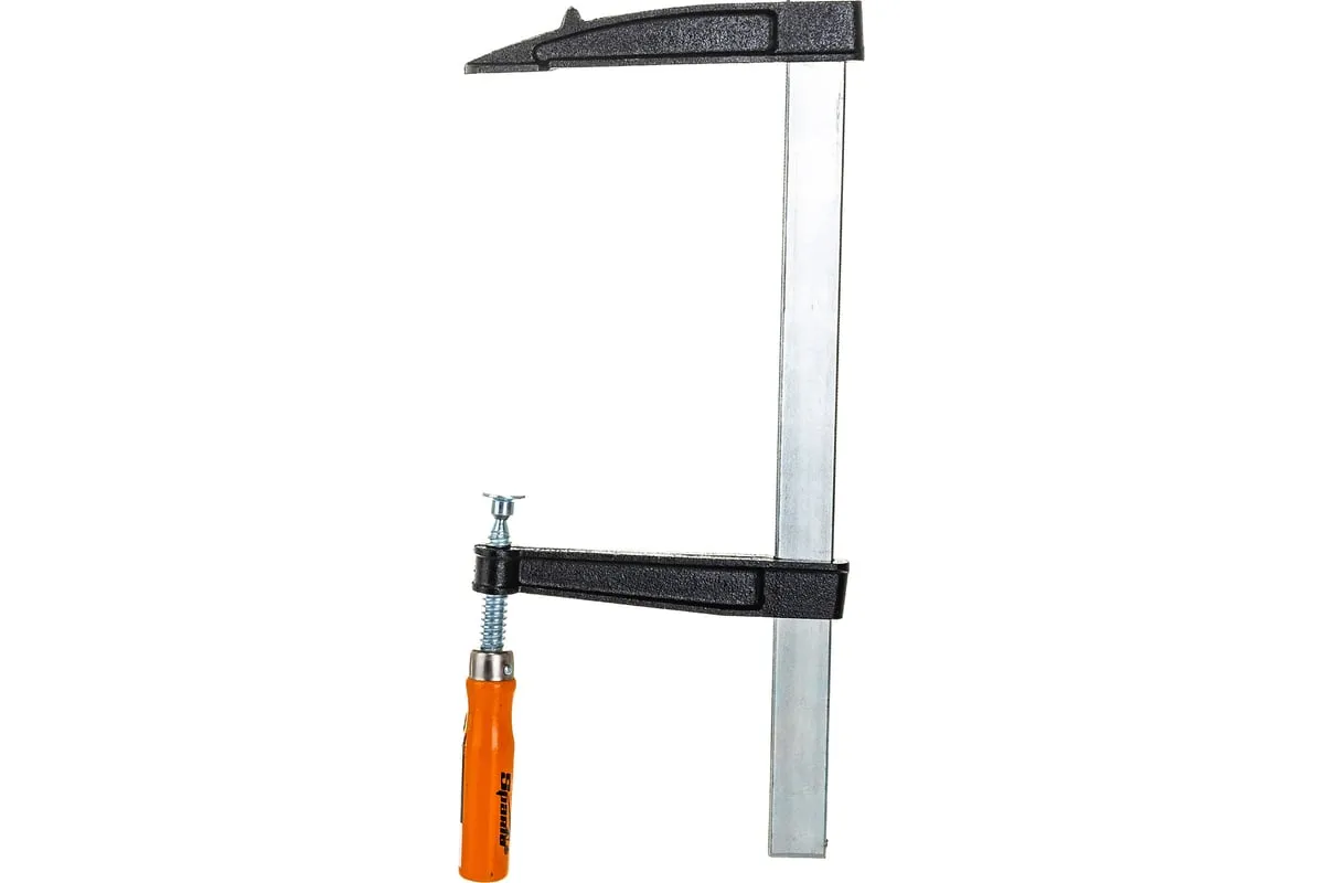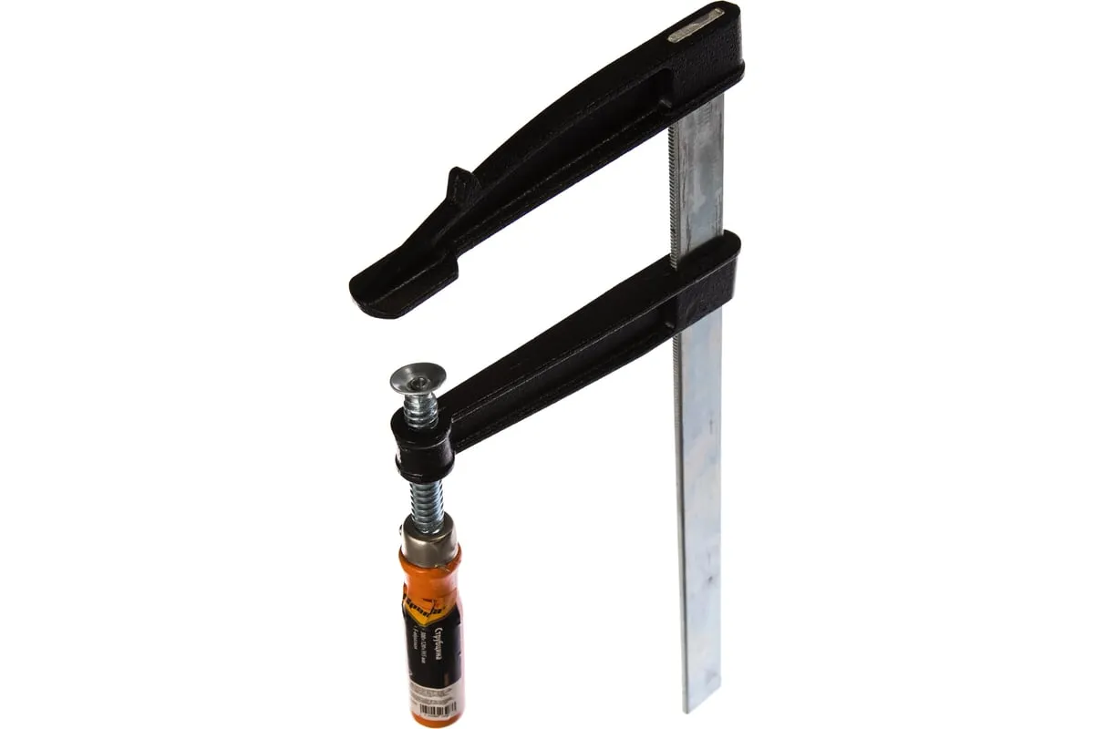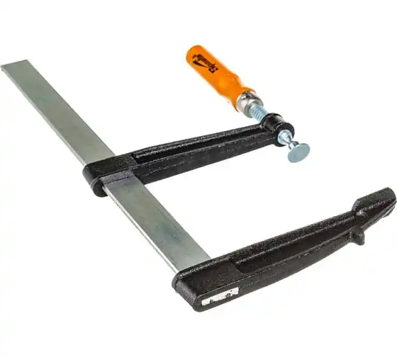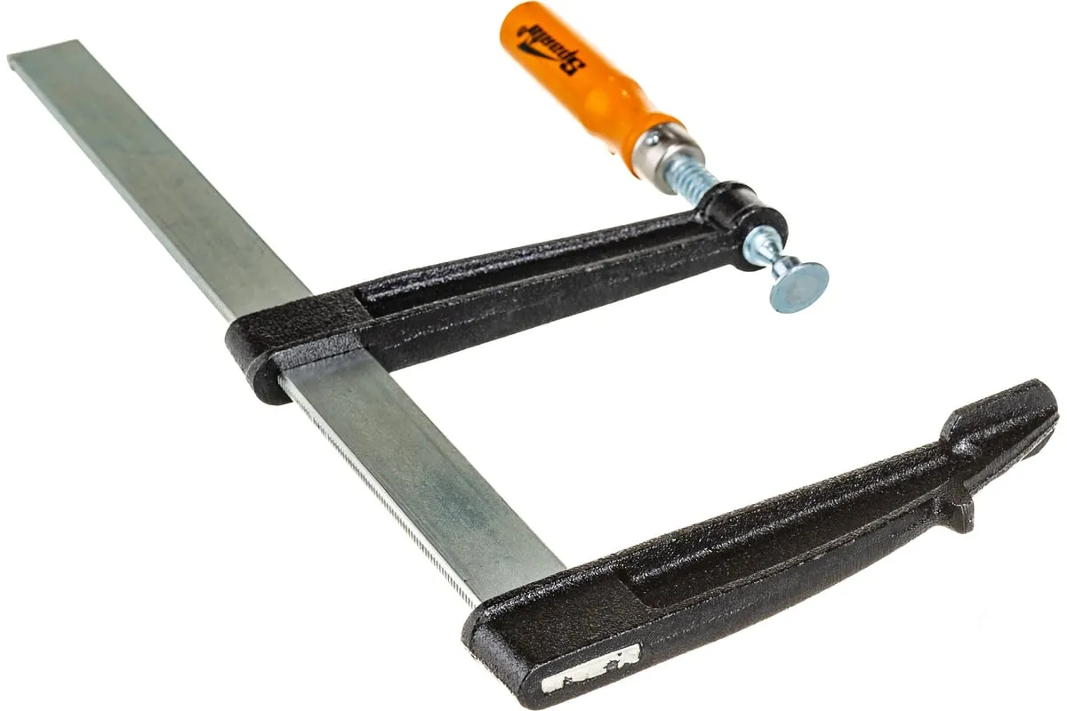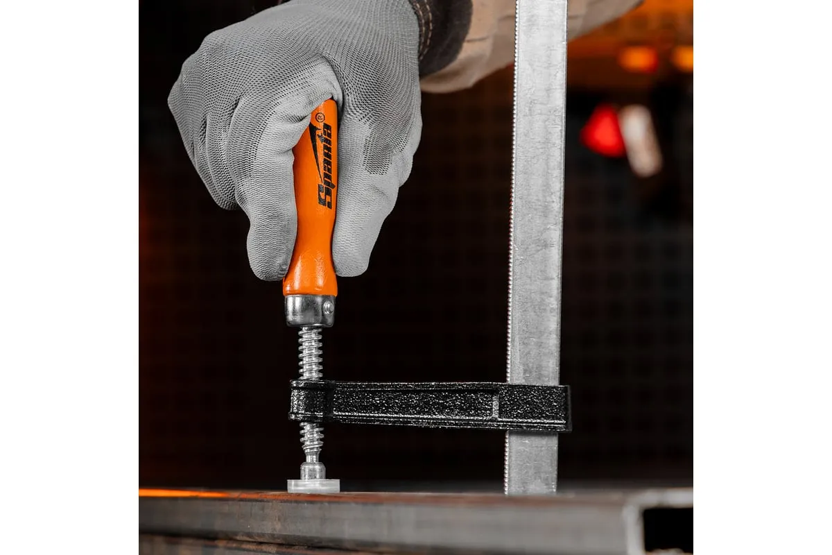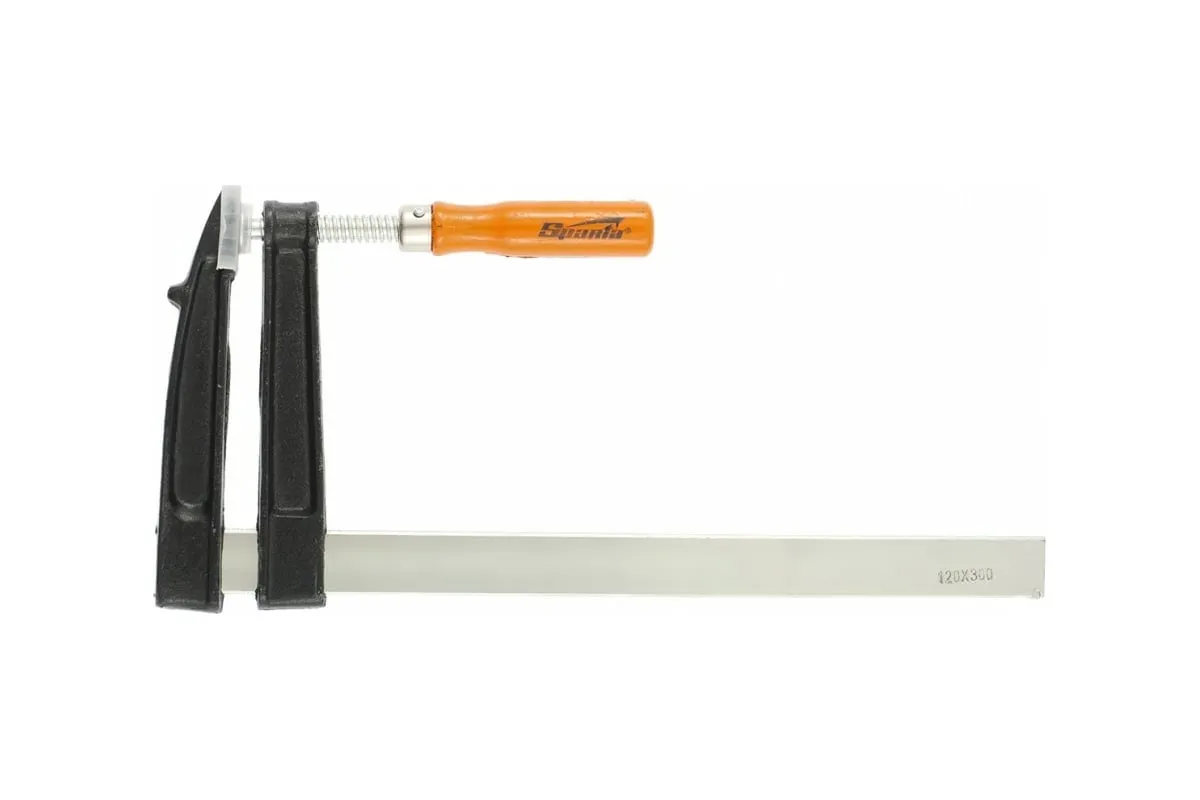F-образная струбцина Sparta 204385, 300 х 120 х 365 мм, используется в столярном и слесарном деле и позволяет фиксировать заготовки из металла, древесины и других материалов для их соединения или обработки. Деталь помещают между губками, одна из которых подвижна и служит для регулировки величины захвата. Винтовой зажим позволяет прикладывать значительное усилие для надежной фиксации. Защитные накладки предотвращают повреждение детали. Элементы конструкции выдерживают высокую температуру, поэтому струбцина подходит для проведения сварочных работ, при этом пластиковые накладки необходимо снять.