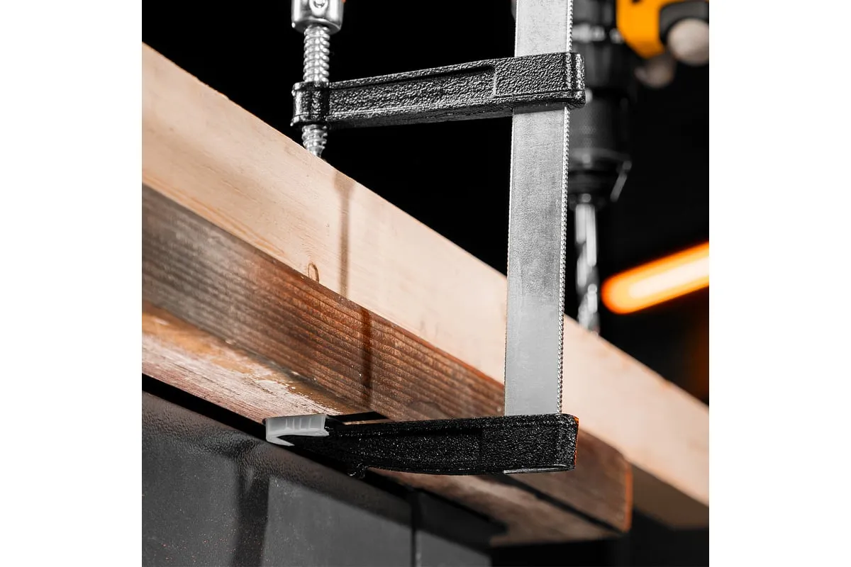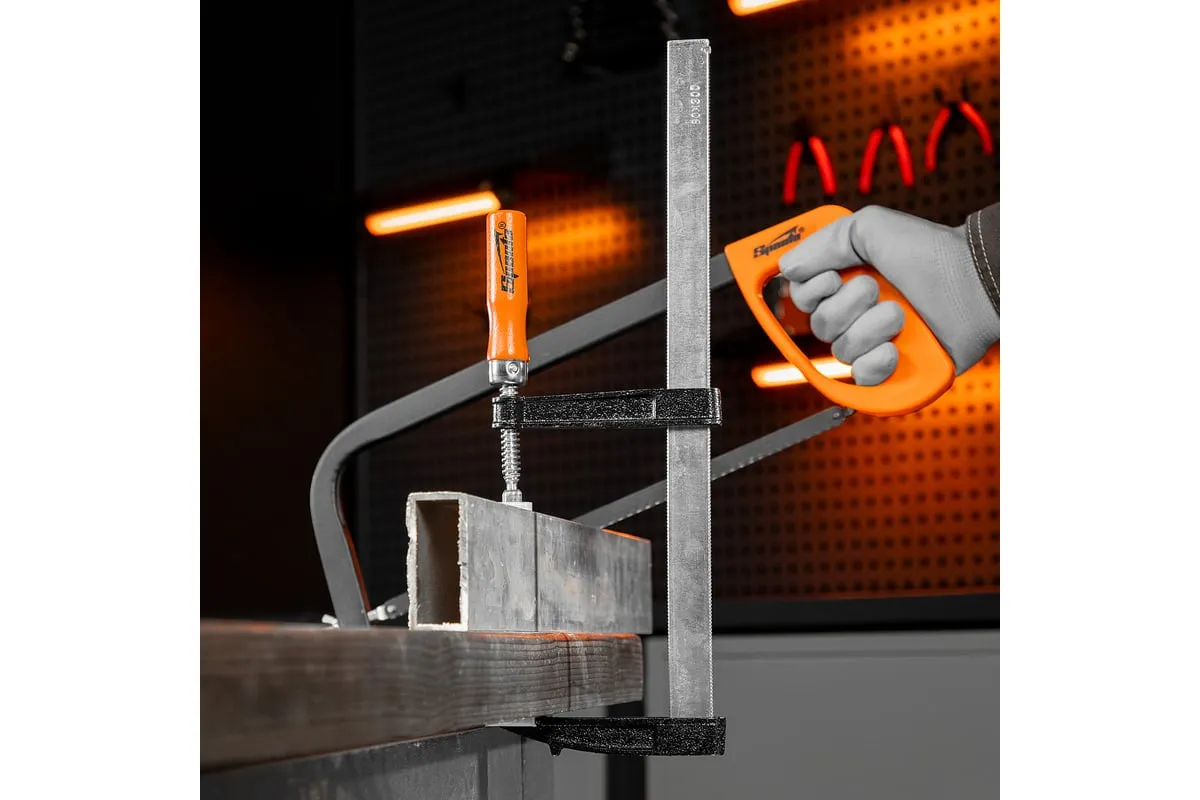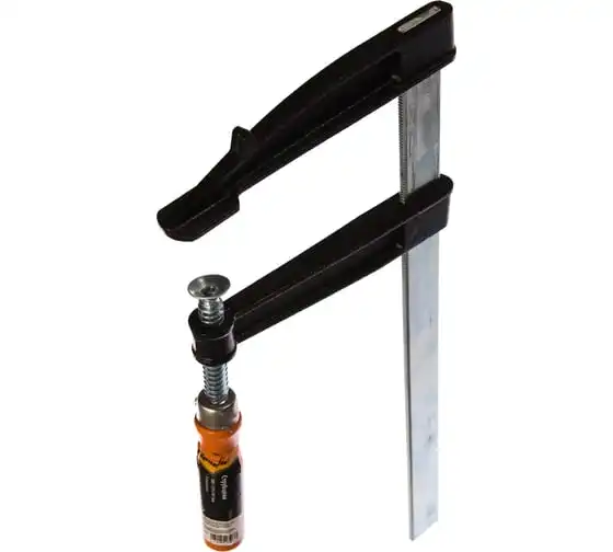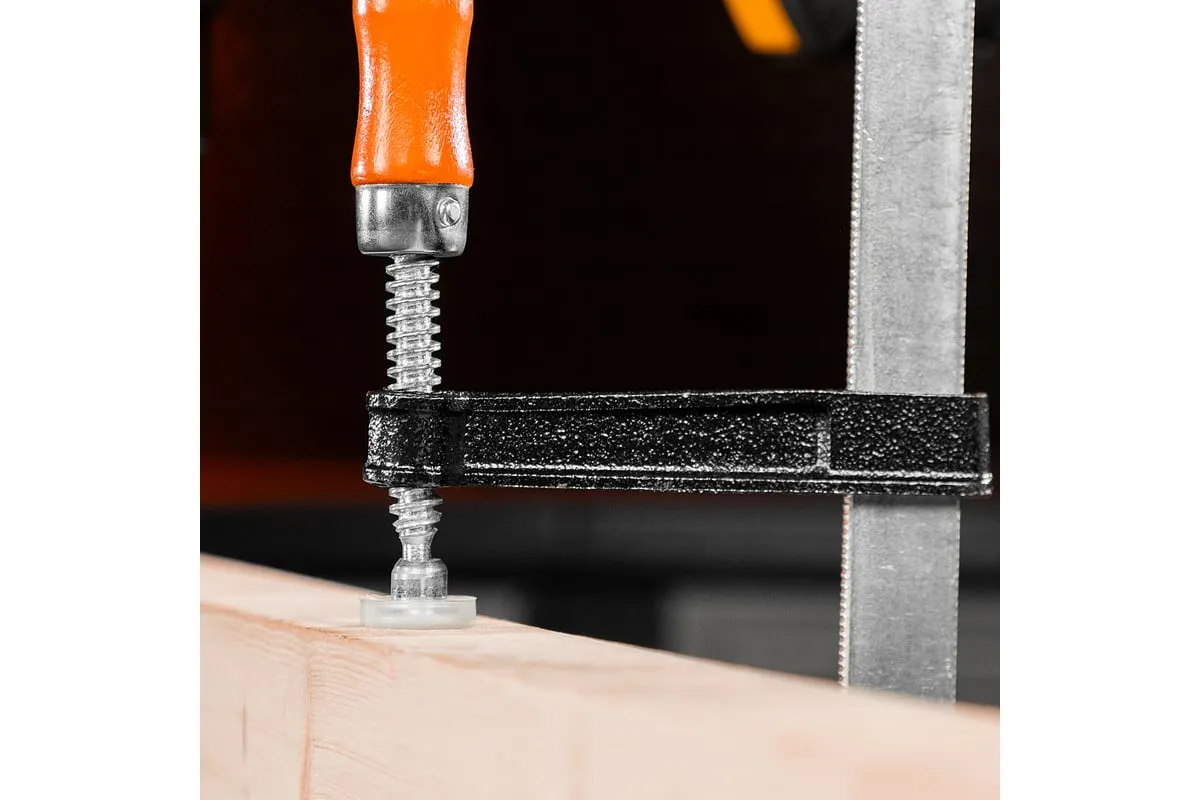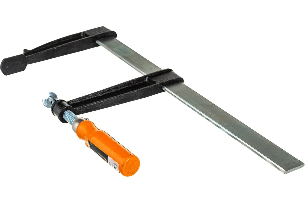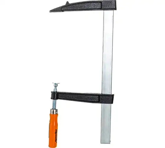 F-образная струбцина Sparta 204385, 300 х 120 х 365 мм, используется в столярном и слесарном деле и позволяет фиксировать заготовки из металла, древесины и других материалов для их соединения или обработки. Деталь помещают между губками, одна из которых подвижна и служит для регулировки величины захвата. Винтовой зажим позволяет прикладывать значительное усилие для надежной фиксации. Защитные накладки предотвращают повреждение детали. Элементы конструкции выдерживают высокую температуру, поэтому струбцина подходит для проведения сварочных работ, при этом пластиковые накладки необходимо снять.