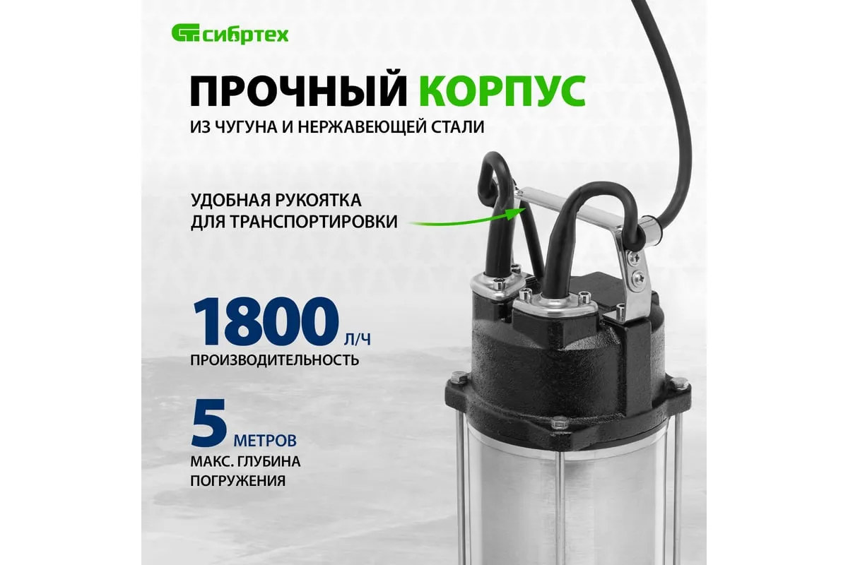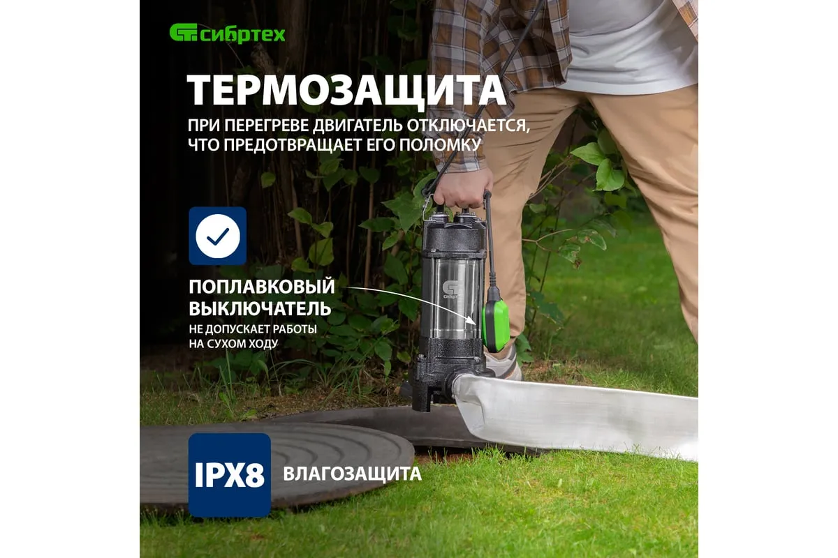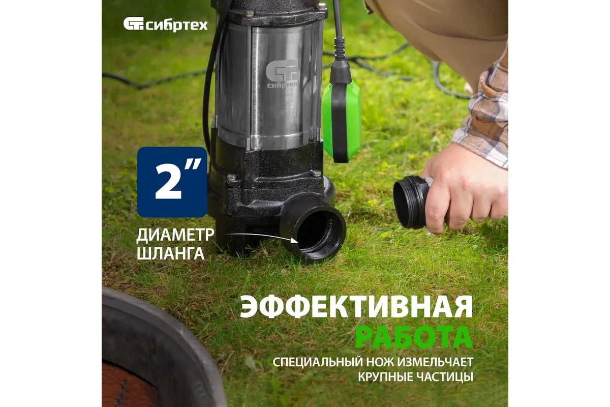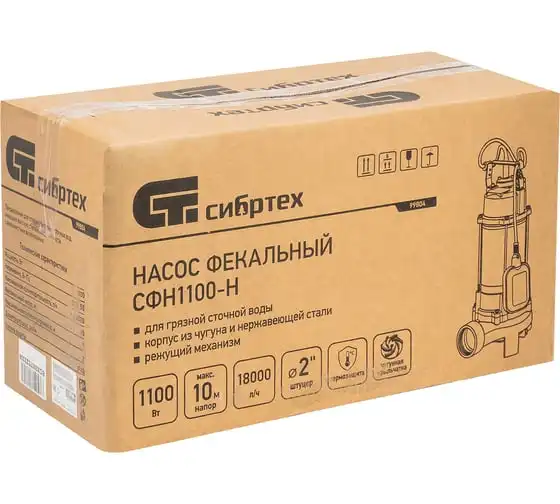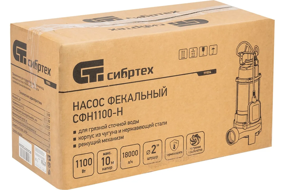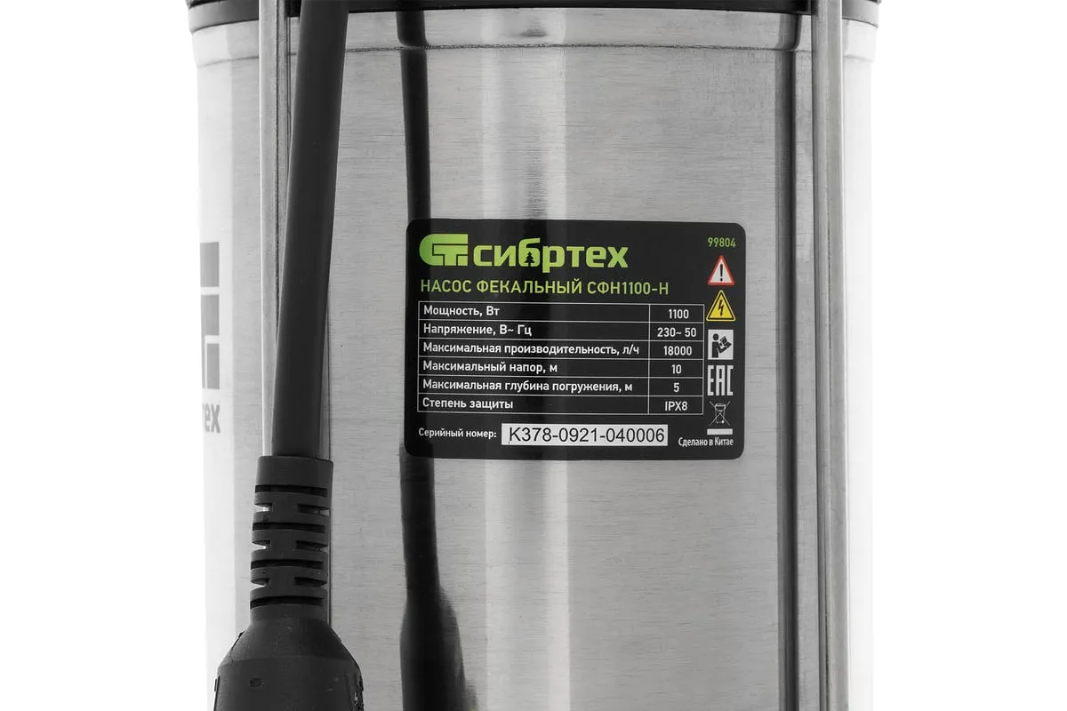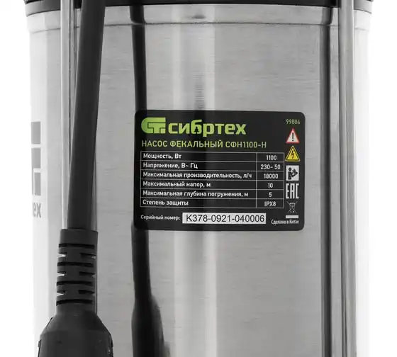 Фекальный насос Сибртех СФН1100-Н 99804 с ножом имеет мощность 1100 Вт и производительность до 18000 л/ч, обеспечивает напор до 10 м, подходит для шлангов диаметром 2 дюйма и применяется для работы с чистой или грязной водой на глубине погружения до 5 м. Используется для перекачки жидкости из стоков, выгребных ям, емкостей и водоемов, а также для аварийной откачки воды из подвалов, погребов, траншей, котлованов. Его можно использовать для организации систем полива на даче. Насос оптимален для установки в канализационной системе: специальный нож измельчает крупные частицы, что позволяет избежать засорения. Также работает с холодными стоками, при этом температура жидкости не должна превышать 35 градусов.