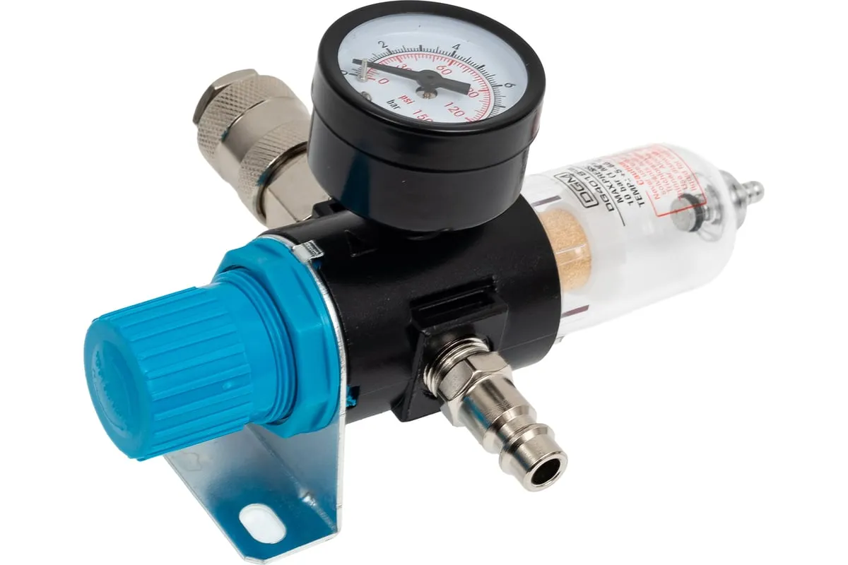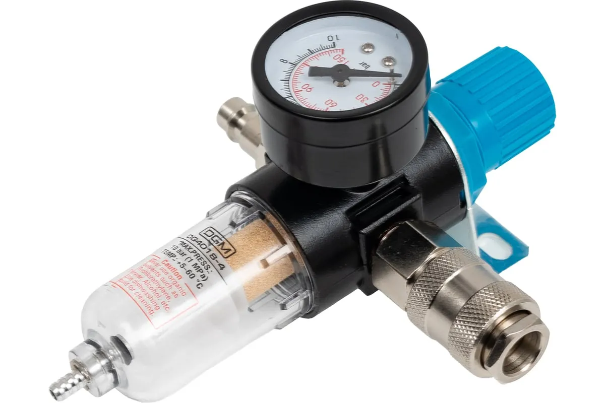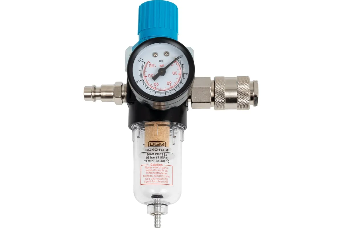 Фильтр воздушный DGM с регулятором давления (DG4018-4) - регулировка давления воздуха; масло- влагоотделение. Установлены быстросъемные соединения для простоты подключения к компрессору. Присоединительная резьба: 1/4". Быстросъёмные соединения: МАМА и ПАПА.