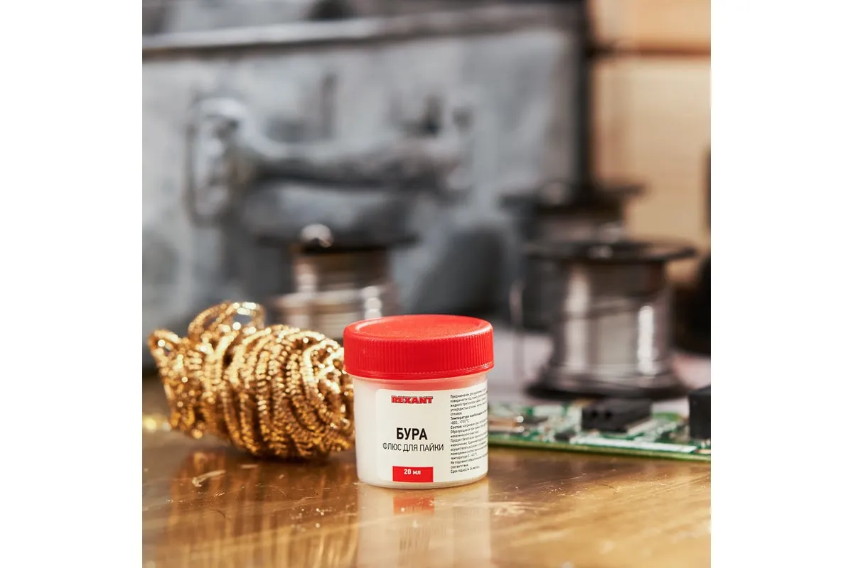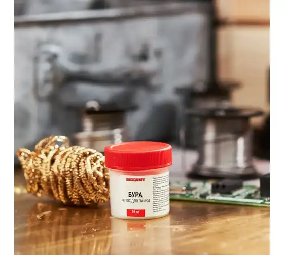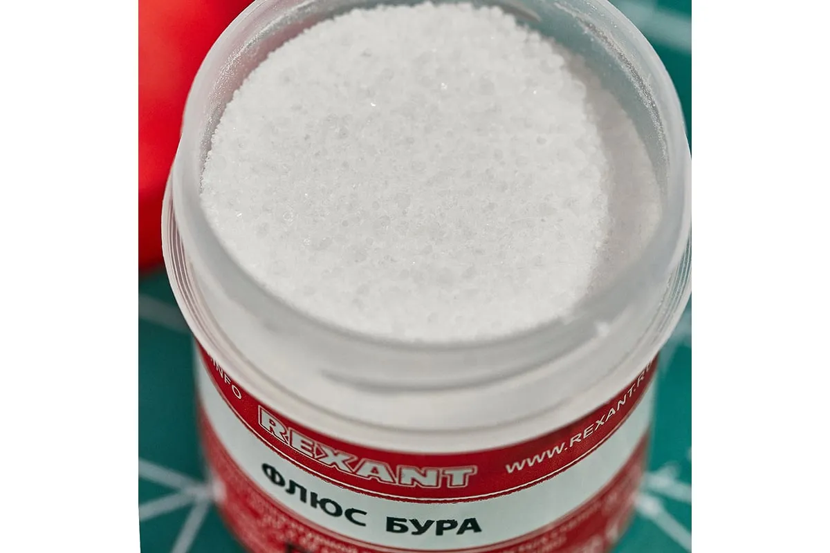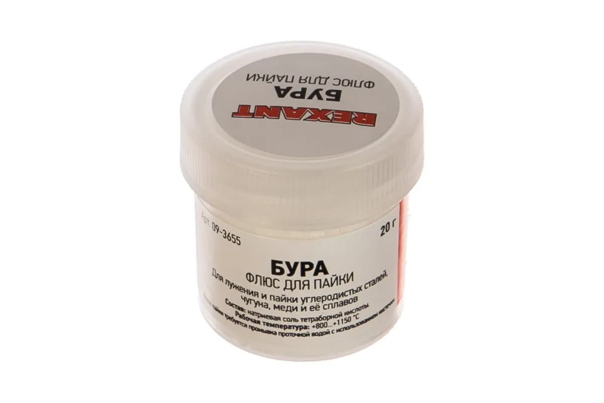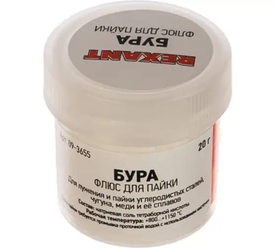 Флюс БУРА REXANT 09-3655 предназначен для удаления оксидов с поверхности под пайку, улучшения растекания жидкого припоя при пайке углеродистых сталей, чугуна, меди и её сплавов медно-цинковыми и серебряными припоями. Позволяет осуществлять сплавление обычных металлов с благородными посредством газопламенного нагрева. Применяется для пайки ювелирных украшений из золота, серебра, мельхиора в температурном диапазоне 800-1150ºC. После пайки требуется промывка горячей водой с использованием кисточки или щетки. Состав: натриевая соль тетраборной кислоты. Масса — 20 гр.