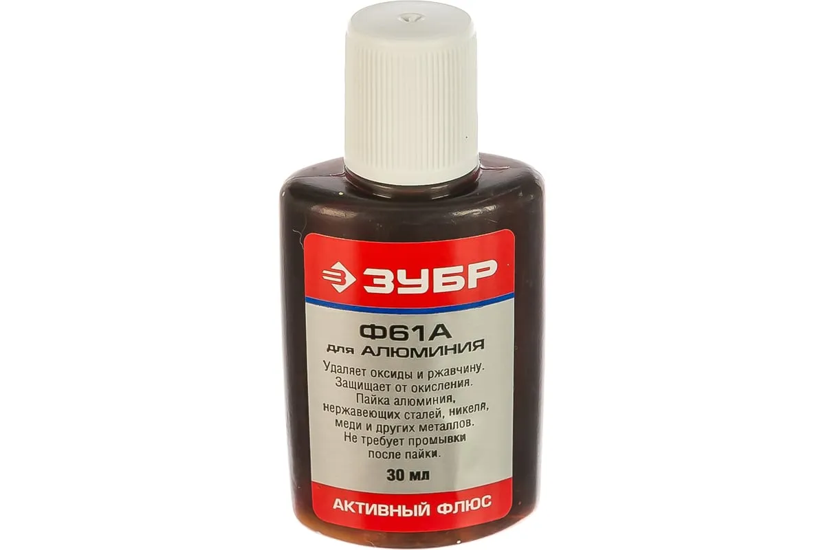 Флюс Ф61А Зубр 55493-030 применяется для удаления оксидов с поверхности под пайку. Требует отмывки смоченной в спирте салфеткой.