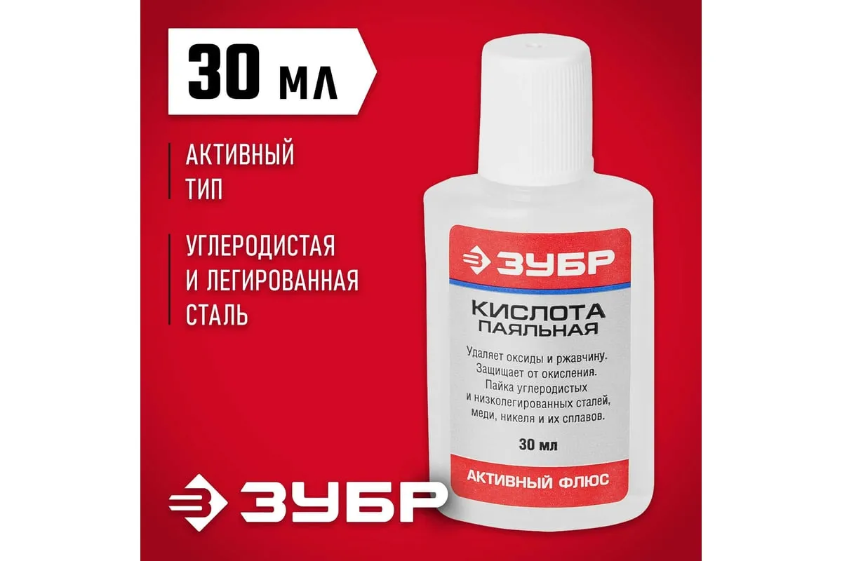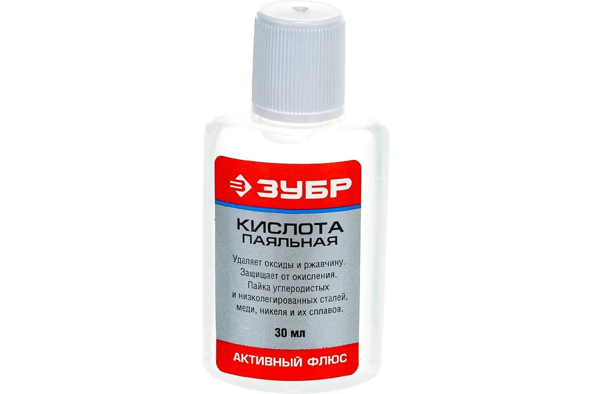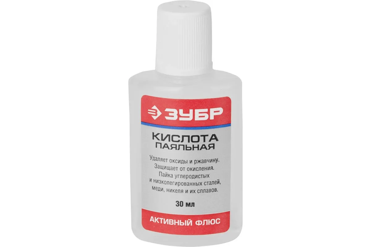 Флюс паяльная кислота ЗУБР 30 мл 55491-030 применяется для пайки углеродистых и низколегированных сталей, меди, никеля и сплавов. Растворяет и удаляет оксиды и загрязнения с поверхности паяемого соединения. Необходима отмывка 5% раствором кальцинированной соды.