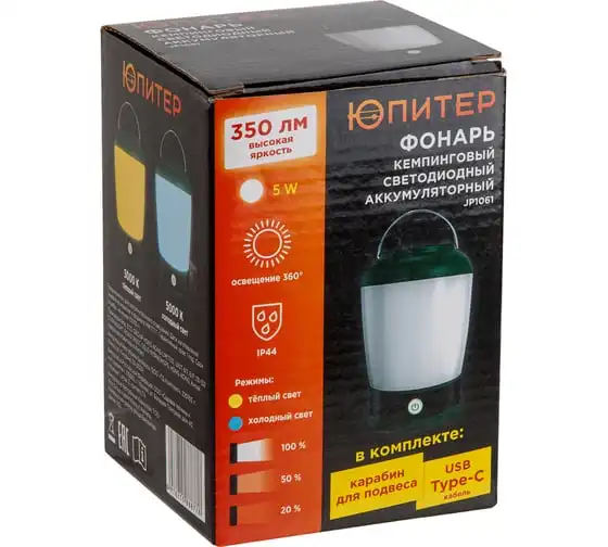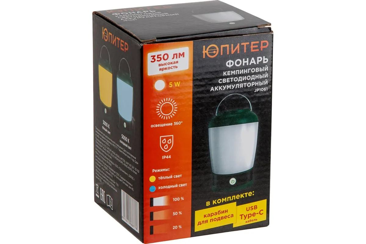 Фонарь светодиодный кемпинговый 5 Вт ЮПИТЕР (JP1061) - отличный помощник на отдыхе в походе, на работе в гараже или любых других ситуациях. Отличается практичным корпусом, с возможностью установить на ровную поверхность или подвесить. Современный разъем USB Type-C (кабель для зарядки в комплекте) поможет зарядить фонарь в любом месте при наличии USB-зарядки, подключение к Power Bank может продлить время работы. Встроенный Li-ion аккумулятор заряжается гораздо быстрее классических аккумуляторов. 2 вида освещения с теплым 3000К или холодным 5000К светом помогут создать уютную обстановку на природе, в палатке или любом другом месте.