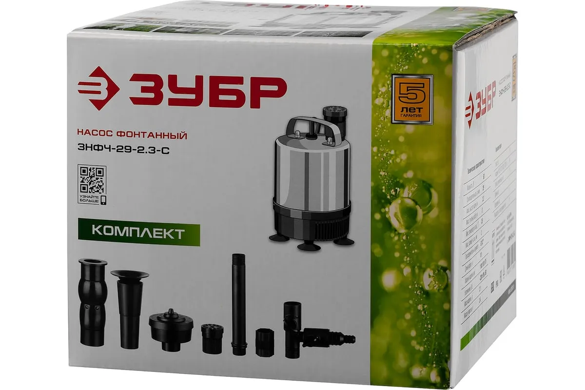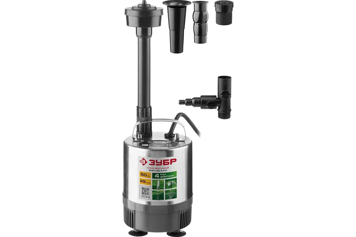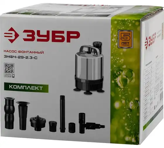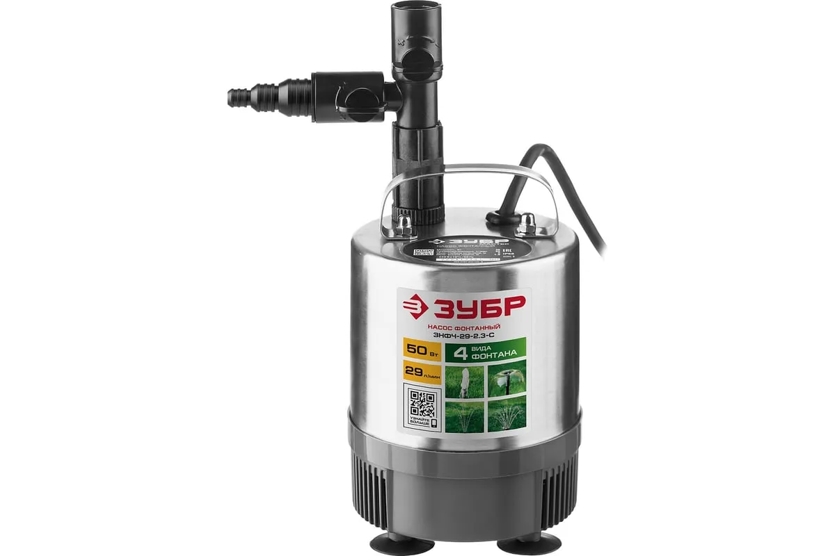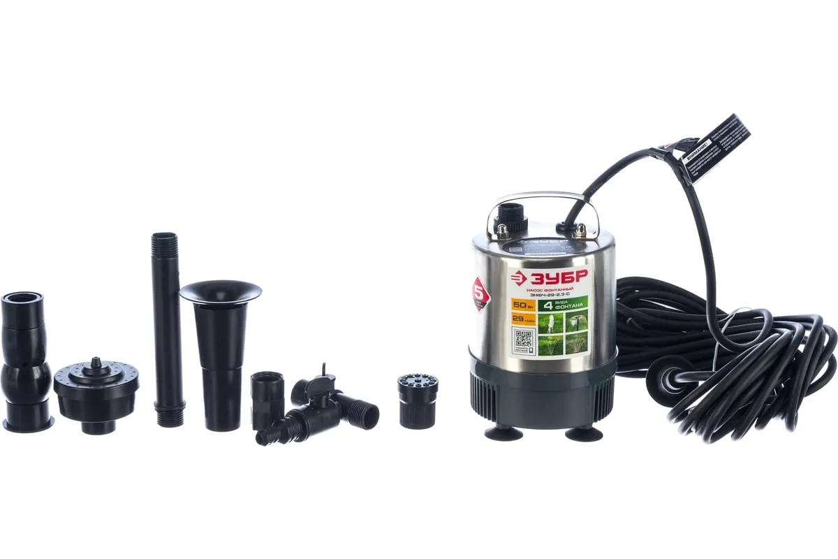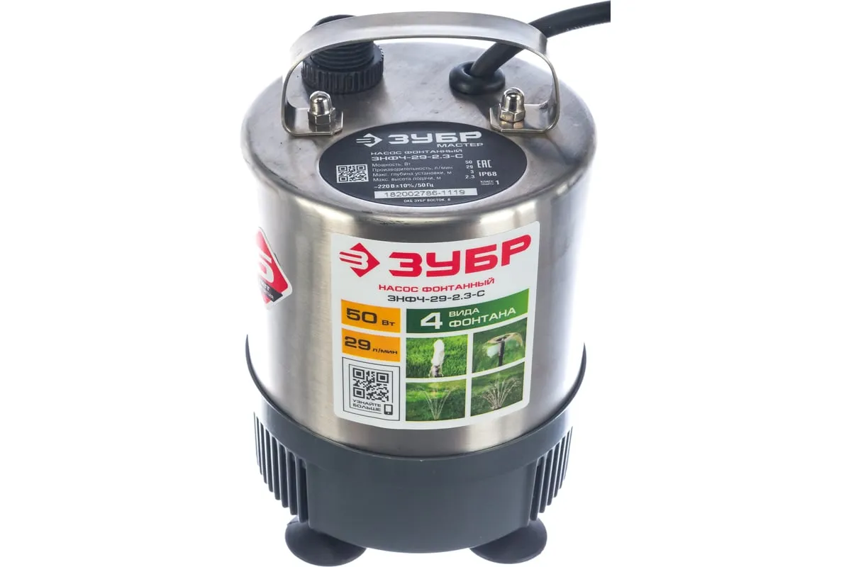 Фонтанный насос Зубр ЗНФЧ-29-2.3-С предназначен для украшения или декорирования пруда на приусадебном участке. Позволяет создавать фонтаны с различными типами струй или водопад. Комплектуется четырьмя насадками (колокольчик, гейзер, большой и малый каскады). Удлинительная трубка в комплекте позволяет отрегулировать высоту основания фонтана. Насос не требует специального обслуживания, прост и удобен в эксплуатации. Корпус из нержавеющей стали гарантирует длительный срок службы изделия. Идеальное решение для небольших и средних прудов. В насосе предусмотрен фильтр - для исключения попадания загрязнений в механизм.