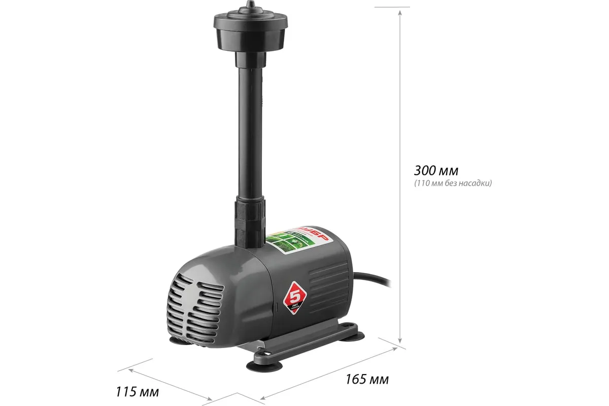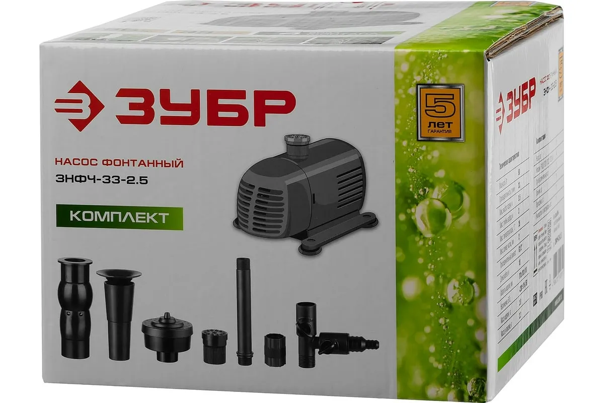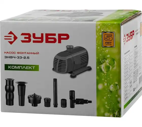 Фонтанный насос Зубр ЗНФЧ-33-2.5 имеет корпус из высококачественного пластика. На основании аппарата предусмотрены специальные присоски - для надежного крепления ко дну искусственного водоема. Максимальная глубина установки насоса составляет 3 метра. В комплект поставки входят четыре насадки для получения различных типов струи. В конструкции предусмотрен губчатый фильтр, который предотвращает попадание твердых частиц внутрь механизма.
