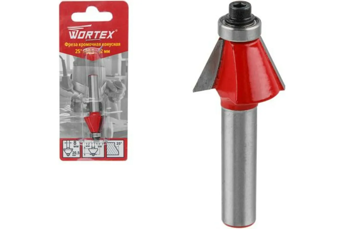 Фреза кромочная конусная по дереву 20.5x12x52 мм WORTEX 0318099 применяется для выполнения фаски на кромках столярных изделий, декоративной обработки кромок столешниц и элементов корпусной мебели.