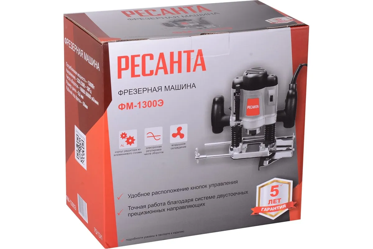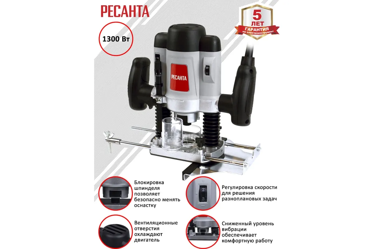 Среди преимуществ модели Ресанта ФМ-1300Э важно отметить возможность регулировки глубины, что расширяет возможности фрезеровщика и обеспечивает высокую точность работы. Во фрезере реализована возможность регулировки скорости, что позволяет решать разноплановые задачи. Модель оснащена блокировкой шпинделя, широкой подставкой, прочной алюминиевой подошвой, эргономичными ручками и пониженной вибрацией. Всё это делает работу с фрезером удобной и безопасной. Инструмент питается от бытовой электросети 200 В, 50 Гц. Машина предназначена исключительно для домашнего использования.